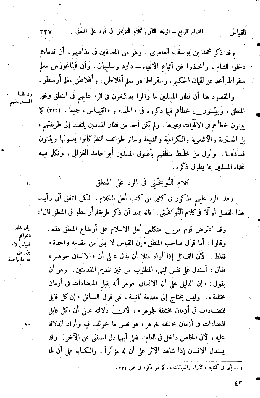 "وقد اعترض قوم من متكلمي أهل الإسلام على اوضاع المنطق هذه وقالوا أما قول صاحب المنطق: "أن القياس لا يبنى من مقدمة واحدة" فغلط لأن القائل إذا أراد مثلا أن يدل على أن الإنسان جوهر فقال استدل على نفس الشيء المطلوب من غير تقديم المقدمتين وهو أن يقول: "أن الدليل على أن الإنسان جوهر أنه يقبل المتضادات في أزمان مختلفة" وليس يحتاج إلى مقدمة ثانية هي قول القائل: "أن كل قابل للمتضادات في ازمان مختلفة فجوهر" لأن دلالته على أن "كل قابل للمتضادات في ازمان مختلفة فجوهر" هو نفس ما خولف فيه واراد الدلالة عليه لأن الخاص داخل في العام فعلى ايهما دل استغنى عن الآخر وقد يستدل الإنسان إذا شاهد الاثر على أن له مؤثرا والكتابة على أن لها