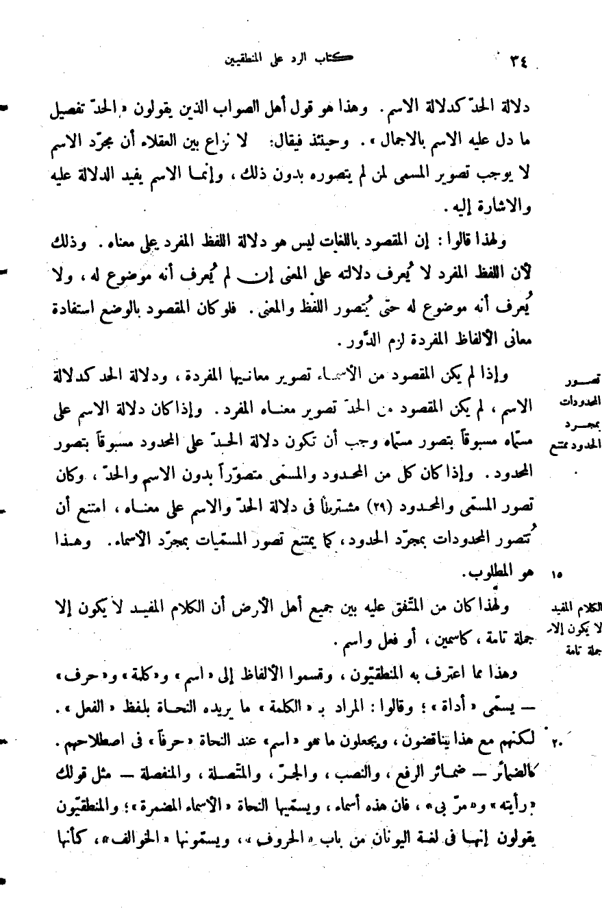 وإذا لم يكن المقصود من الأسماء تصوير معانيها المفردة ودلالة الحد كدلالة الاسم لم يكن المقصود من الحد تصوير معناه المفرد وإذا كان دلالة الاسم على مسماه مسبوقا بتصور مسماه وجب أن تكون دلالة الحد على المحدود مسبوقا بتصور المحدود وإذا كان كل من المحدود والمسمى متصورا بدون الاسم والحد وكان تصور المسمى والمحدود مشتركا في دلالة الحد والاسم على معناه امتنع أن تتصور المحدودات بمجرد الحدود كما يمتنع تصور المسميات بمجرد الأسماء وهذا هو المطلوب.