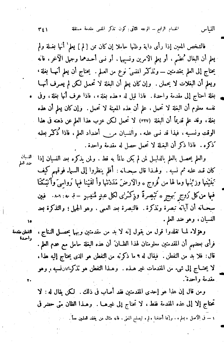 فالشخص المعين إذا رأى دابة وظنها حاملا أن كان ممن لم يعلم أنها بغلة ولم يعلم أن البغال عقم أو يعلم الأمرين ونسيهها أو نسى أحدهما وجهل الآخر فانه يحتاج إلى العلم بمقدمتين وتذكر المنسي نوع من العلم يحتاج أن يعلم أنها بغلة ويعلم أن البغلات لا يحملن وإن كان يعلم أن البغلة لا تحمل لكن لم يعرف أنها بغلة احتاج إلى مقدمة واحدة فإذا قيل له هذه بغلة فإذا عرف أنها بغلة وفي نفسه معلوم أن البغلة لا تحمل علم أن هذه المعينة لا تحمل وإن كان يعلم أن هذه بغلة وقد علم قديما أن البغلة لا تحمل لكن عزب هذا العلم عن ذهنه في هذا الوقت ونسيه فهذا قد نسى علمه والنسيان من اضداد العلم فإذا ذكر بعلمه ذكره فإذا ذكر أن البغلة لا تحمل حصل له مقدمة واحدة.