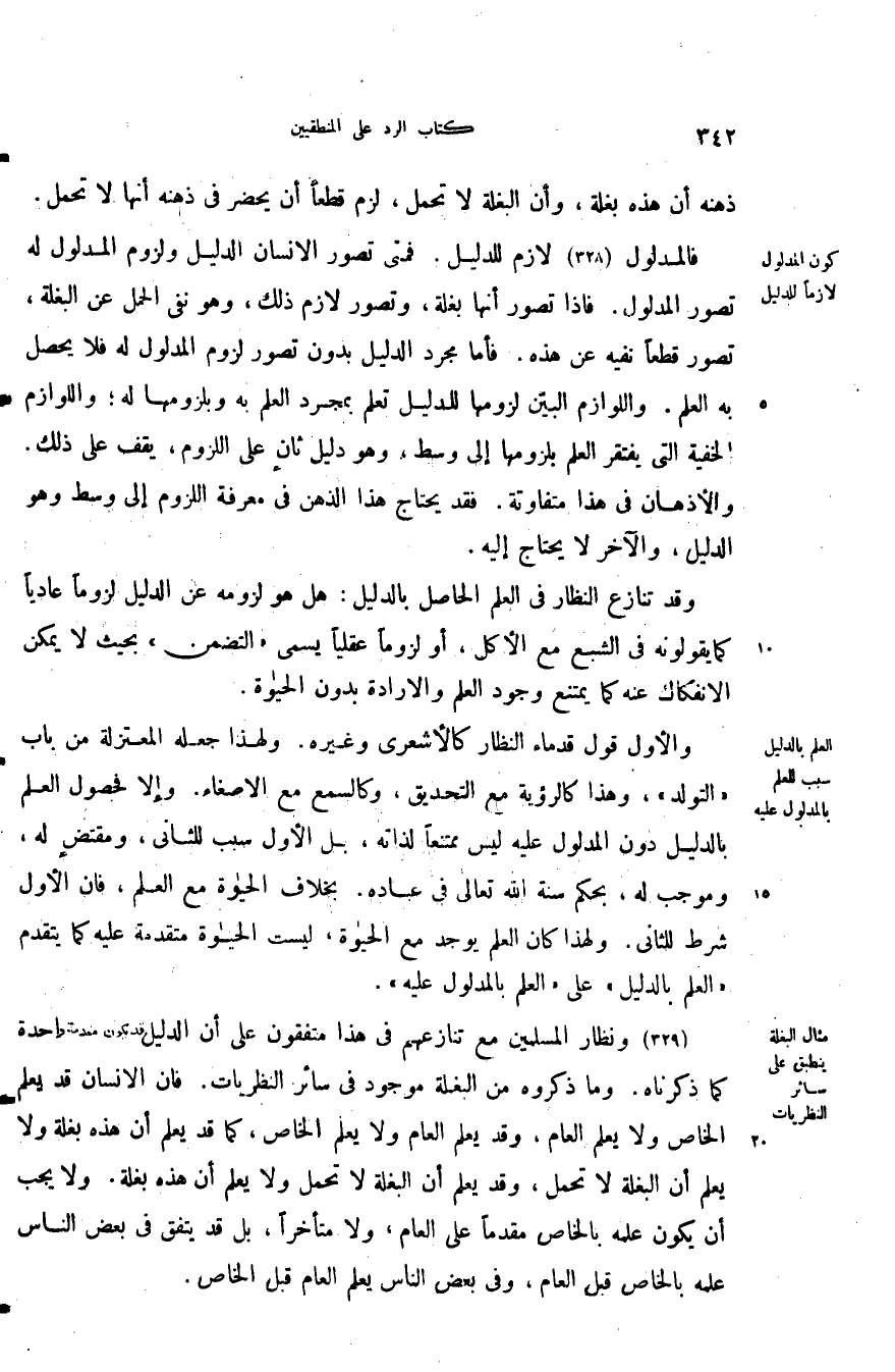 ونظار المسلمين مع تنازعهم في هذا متفقون على أن الدليل مقدمة واحدة كما ذكرناه وما ذكروه من البغلة موجود في سائر النظريات فان الإنسان قد يعلم الخاص ولا يعلم العام وقد يعلم العام ولا يعلم الخاص كما قد يعلم أن هذه بغلة ولا يعلم أن البغلة لا تحمل وقد يعلم أن البغلة لا تحمل ولا يعلم أن هذه بغلة ولا يجب أن يكون علمه بالخاص مقدما على العام ولا متاخرا بل قد يتفق في بعض الناس علمه بالخاص قبل العام وفي بعض الناس يعلم العام قبل الخاص