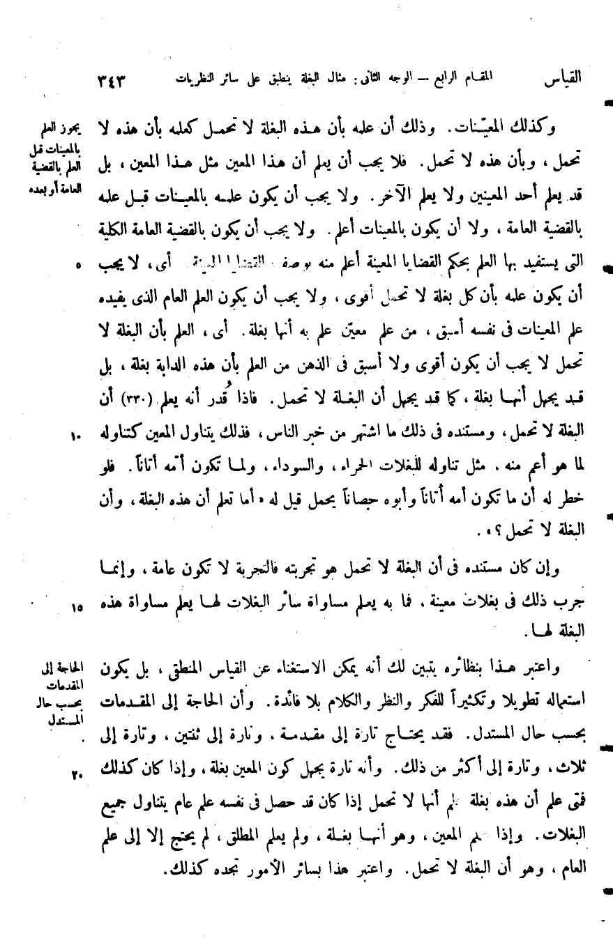 واعتبر هذا بنظائره يتبين لك أنه يمكن الاستغناء عن القياس المنطقي بل يكون استعماله تطويلا وتكثيرا للفكر والنظر والكلام بلا فائدة وان الحاجة إلى المقدمات بحسب حال المستدل فقد يحتاج تارة إلى مقدمة وتارة إلى ثنتين وتارة إلى ثلاث وتارة إلى أكثر من ذلك وانه تارة يجهل كون المعين بغلة وإذا كان كذلك فمتى علم أن هذه بغلة علم أنها لا تحمل إذا كان قد حصل في نفسه علم عام يتناول جميع البغلات وإذا علم المعين وهو أنها بغلة ولم يعلم المطلق لم يحتج إلا إلى علم العام وهو أن البغلة لا تحمل واعتبر هذا بسائر الأمور تجده كذلك