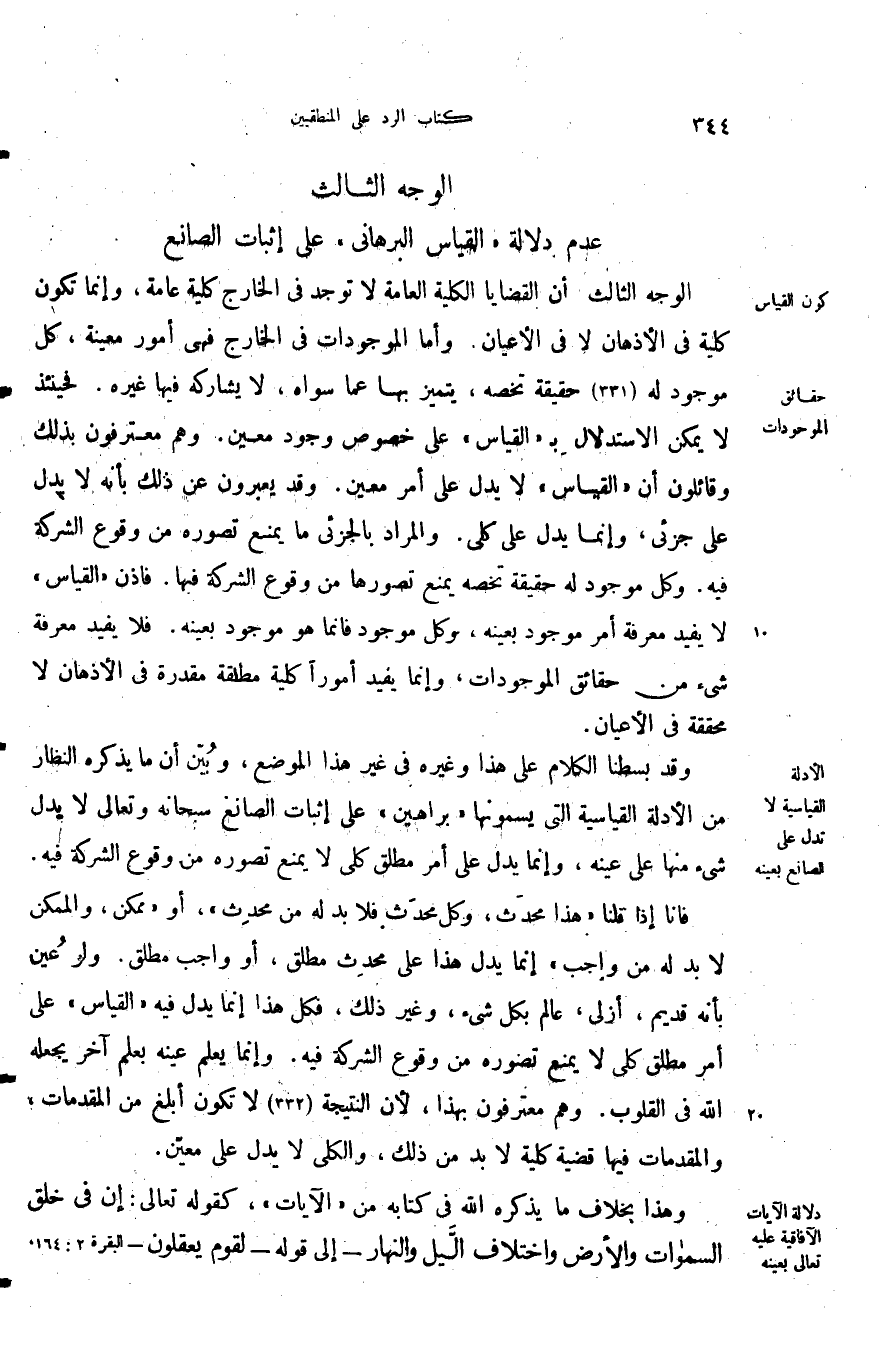 الوجه الثالث: أن القضايا الكلية العامة لا توجد في الخارج كلية عامة وإنما تكون كلية في الأذهان لا في الأعيان وأما الموجودات في الخارج فهي أمور معينة كل موجود له حقيقة تخصه يتميز بها عما سواه لا يشاركه فيها غيره فحينئذ لا يمكن الاستدلال بالقياس على خصوص وجود معين وهم معترفون بذلك وقائلون أن القياس لا يدل على أمر معين وقد يعبرون عن ذلك بأنه لا يدل على جزئي وإنما يدل على كلي والمراد بالجزئي ما يمنع تصوره من وقوع الشركة فيه وكل موجود له حقيقة تخصه يمنع تصورها من وقوع الشركة فيها فإذن القياس لا يفيد معرفة أمر موجود بعينه وكل موجود فإنما هو موجود بعينه فلا يفيد معرفة شيء من حقائق الموجودات وإنما يفيد أمورا كلية مطلقة مقدرة في الأذهان لا محققة في الأعيان.