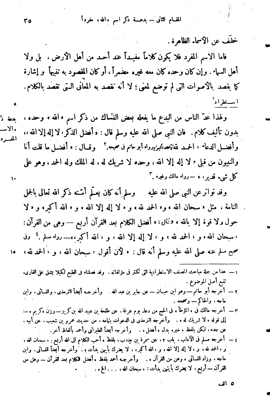ولهذا عد الناس من البدع ما يفعله بعض النساك من ذكر اسم الله وحده بدون تأليف كلام فان النبي صلى الله عليه وسلم قال: "أفضل الذكر لا إله إلا الله وأفضل الدعاء الحمد لله" رواه أبو حاتم في صحيحه وقال: "أفضل ما قلت أنا والنبيون من قبلى لا إله إلا الله وحده لا شريك له له الملك وله الحمد وهو على كل شيء قدير" رواه مالك وغيره.