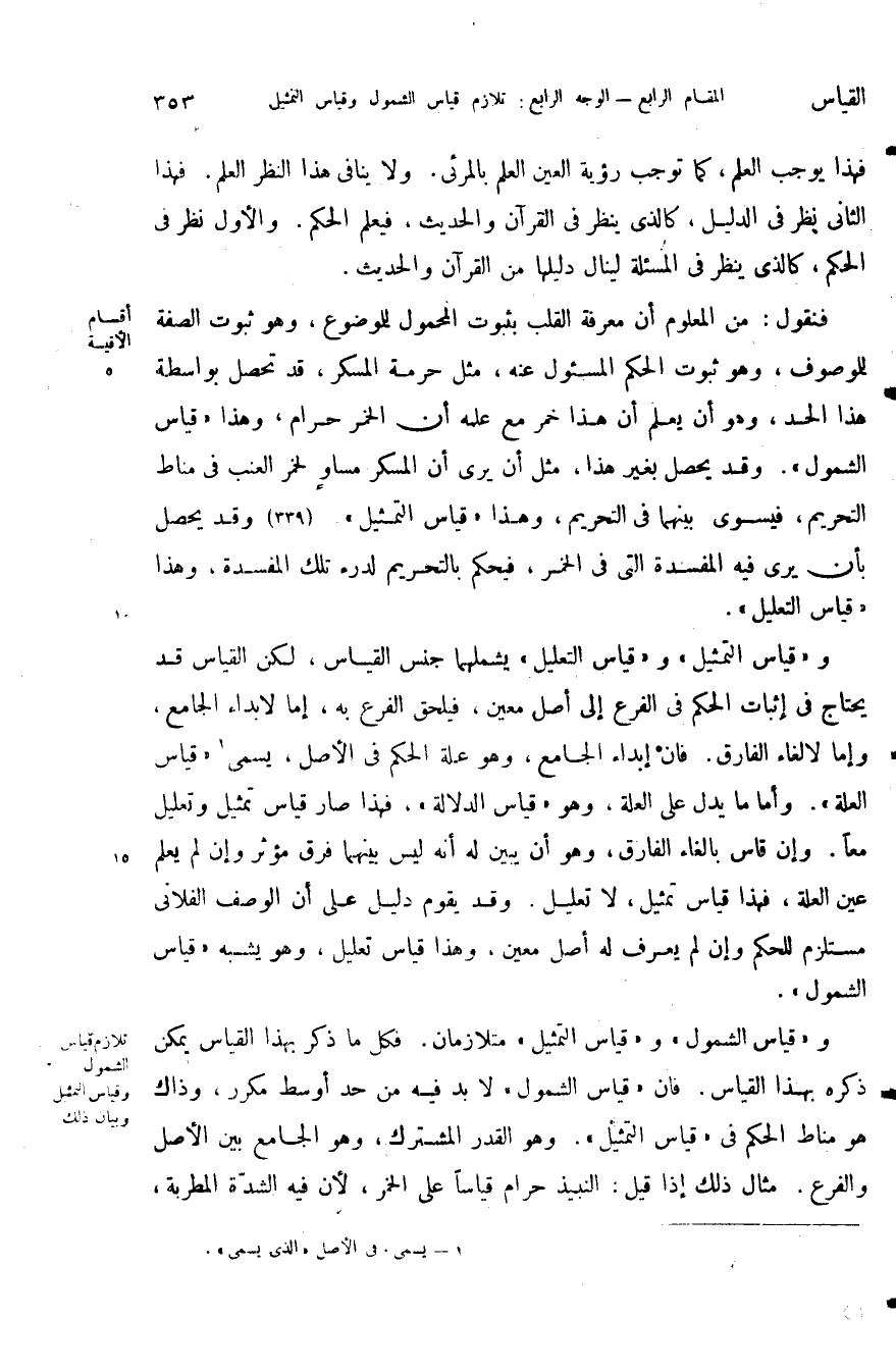 فنقول من المعلوم أن معرفة القلب بثبوت المحمول للموضوع وهو ثبوت الصفة للموصوف وهو ثبوت الحكم المسئول عنه مثل حرمة المسكر قد تحصل بواسطة هذا الحد وهو أن يعلم أن هذا خمر مع علمه أن الخمر حرام وهذا قياس الشمول وقد يحصل بغير هذا مثل أن يرى أن المسكر مساو لخمر العنب في مناط التحريم فيستوي بينهما في التحريم وهذا قياس التمثيل وقد يحصل بأن يرى فيه المفسدة التي في الخمر فيحكم بالتحريم لدرء تلك المفسدة وهذا قياس التعليل.