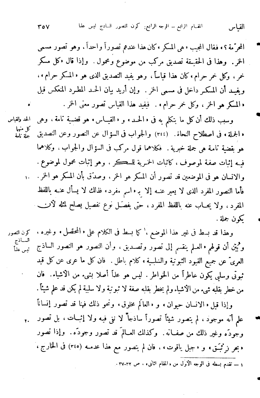 وسبب ذلك أن كل ما يتكلم به في الحد والقياس هو قضية تامة وهي الجملة في اصطلاح النحاة والجواب في السؤال عن التصور وعن التصديق هو بقضية تامة هي جملة خبرية فكلاهما قول مركب في السؤال والجواب وكلاهما فيه إثبات صفة لموصوف كإثبات الخمرية للمسكر وهو إثبات محمول لموضوع والإنسان هو في الموضعين قد تصور أن المسكر هو الخمر وصدق بأن المسكر هو الخمر فأما التصور المفرد الذي لا يعبر عنه إلا ب اسم مفرد فذلك لا يسأل عنه باللفظ المفرد ولا يجاب عنه باللفظ المفرد حتى يفصل نوع تفصيل يصلح لمثله لأن يكون جملة.
