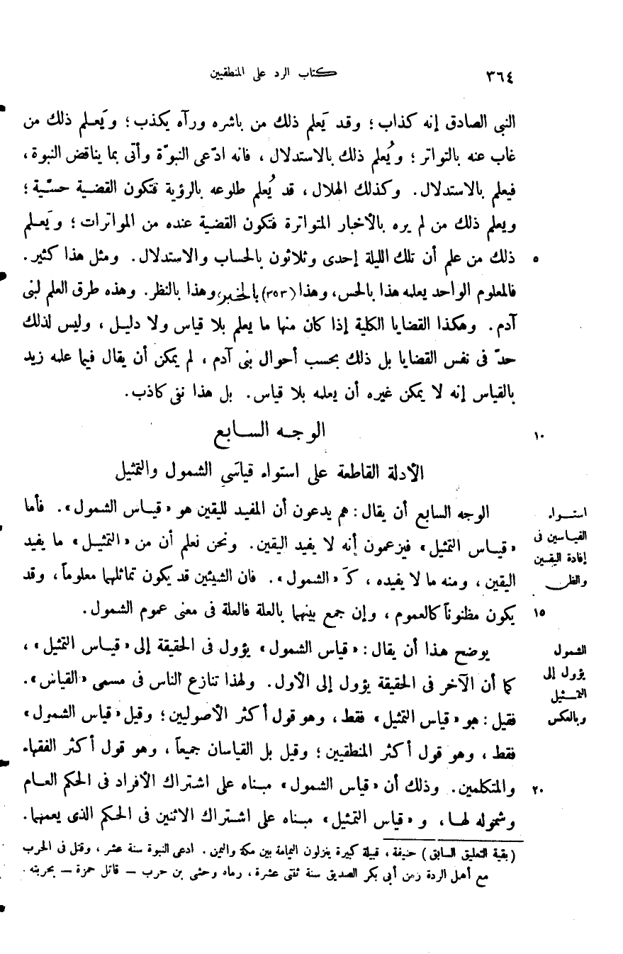 الوجه السابع: أن يقال هم يدعون أن المفيد لليقين هو قياس الشمول فأما قياس التمثيل فيزعمون أنه لا يفيد اليقين ونحن نعلم أن من التمثيل ما يفيد اليقين ومنه ما لا يفيده ك الشمول فان الشيئين قد يكون تماثلهما معلوما وقد يكون مظنونا كالعموم وإن جمع بينهما بالعلة فالعلة في معنى عموم الشمول.