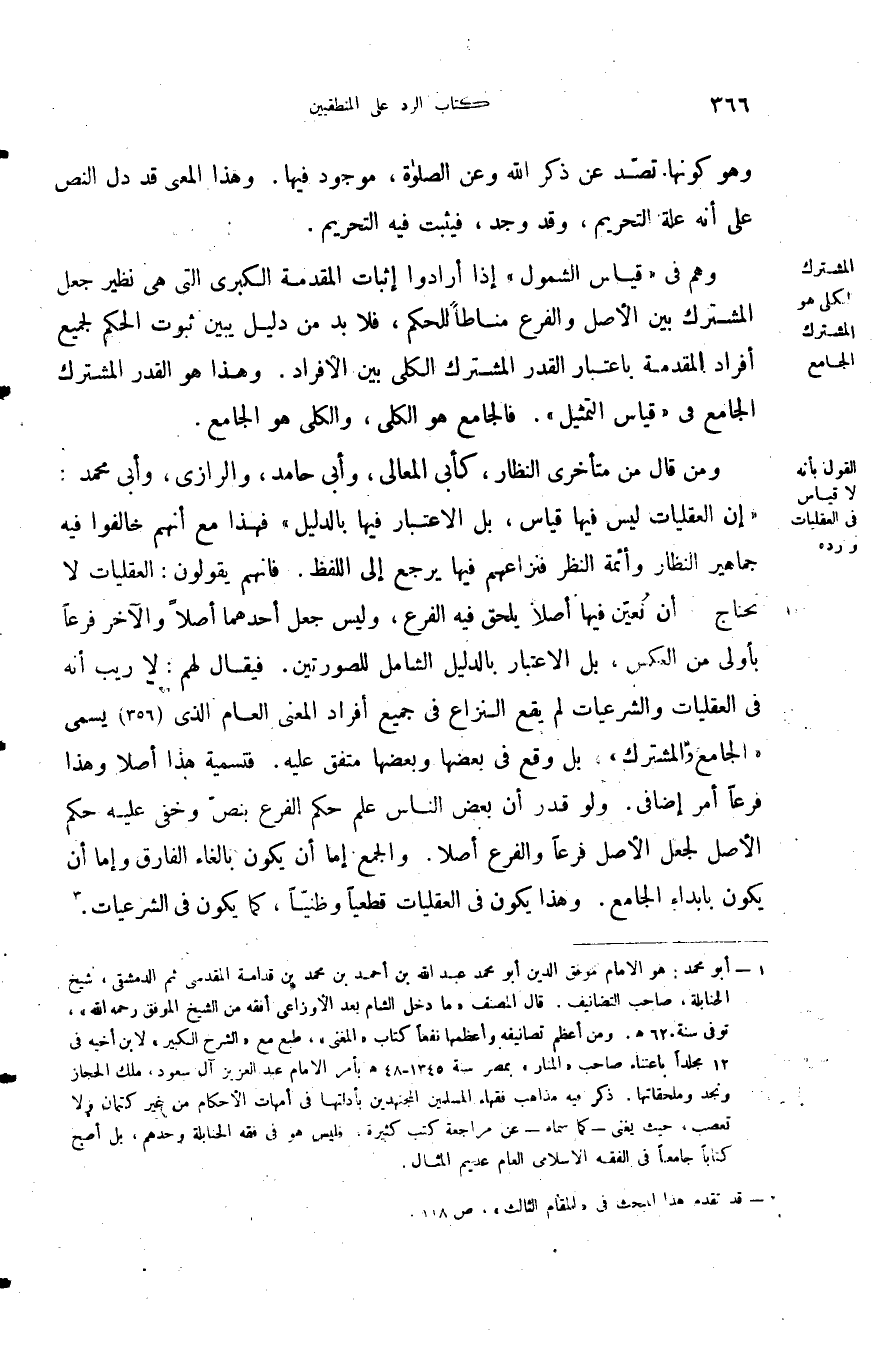 ومن قال من متأخري النظار كأبي المعالي وأبي حامد والرازي وأبي محمد أن العقليات ليس فيها قياس بل الاعتبار فيها بالدليل فهذا مع أنهم خالفوا فيه جماهير النظار وأئمة النظر فنزاعهم فيها يرجع إلى اللفظ فإنهم يقولون العقليات لا تحتاج إلى أن يعين فيها أصل يلحق فيه الفرع وليس جعل أحدهما أصلا والآخر فرعا بأولى من العكس بل الاعتبار بالدليل الشامل للصورتين فيقال لهم لا ريب أنه في العقليات والشرعيات لم يقع النزاع في جميع أفراد المعنى العام الذي يسمى الجامع المشترك بل وقع في بعضها وبعضها متفق عليه فتسمية هذا أصلا وهذا فرعا أمر إضافي ولو قدر أن بعض الناس علم حكم الفرع بنص وخفي عليه حكم الأصل لجعل الأصل فرعا والفرع أصلا والجمع أما أن يكون بإلغاء الفارق وأما أن يكون بإبداء الجامع وهذا يكون في العقليات قطعيا وظنيا كما يكون في الشرعيات