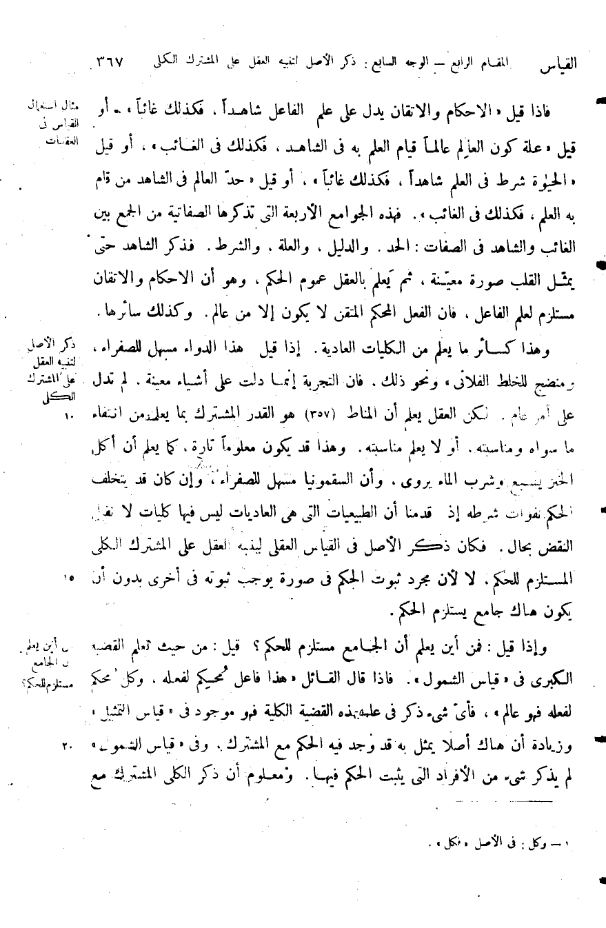 فإذا قيل الأحكام والإتقان يدل على علم الفاعل شاهدا فكذلك غائبا أو قيل علة كون العالم عالما قيام العلم به في الشاهد فكذلك في الغائب أو قيل الحيوة شرط في العلم شاهدا فكذلك غائبا أو قيل حد العالم في الشاهد من قام به العلم فكذلك في الغائب فهذه الجوامع الأربعة التي تذكرها الصفاتية من الجمع بين الغائب والشاهد في الصفات الحد والدليل والعلة والشرط فذكر الشاهد حتى يمثل القلب صورة معينة ثم يعلم بالعقل عموم الحكم وهو أن الأحكام والإتقان مستلزم لعلم الفاعل فان الفعل المحكم المتقن لا يكون إلا من عالم وكذلك سائرها.