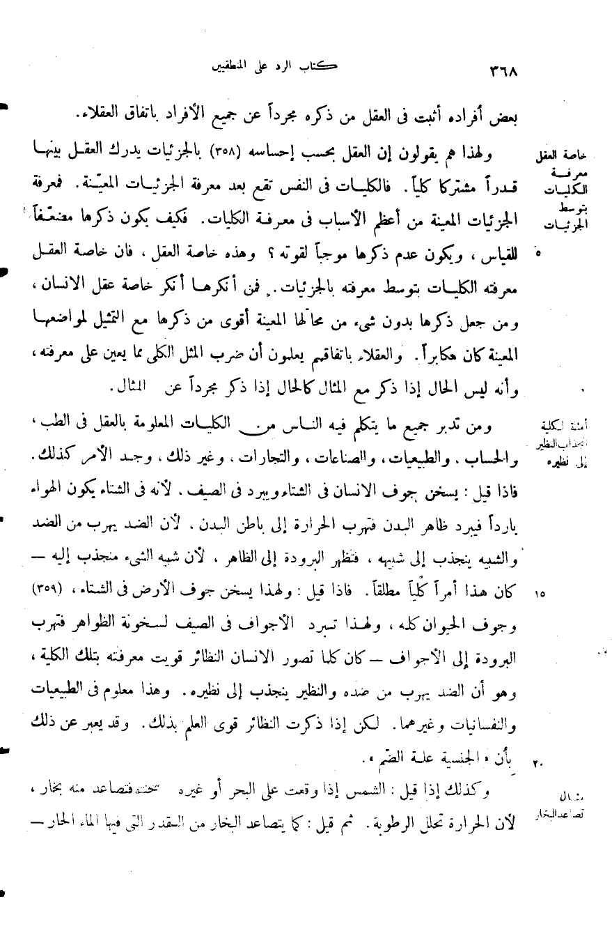 ولهذا هم يقولون أن العقل بحسب إحساسه بالجزئيات يدرك العقل بينها قدرا مشتركا كليا فالكليات في النفس تقع بعد معرفة الجزئيات المعينة فمعرفة الجزئيات المعينة من أعظم الأسباب في معرفة الكليات فكيف يكون ذكرها مضعفا للقياس ويكون عدم ذكرها موجبا لقوته وهذه خاصة العقل فان خاصة العقل معرفته الكليات بتوسط معرفته بالجزئيات فمن أنكرها أنكر خاصة عقل الإنسان ومن جعل ذكرها بدون شيء من محالها المعينة أقوى من ذكرها مع التمثيل لمواضعها المعينة كان مكابرا والعقلاء باتفاقهم يعلمون أن ضرب المثل الكلى مما يعين على معرفته وانه ليس الحال إذا ذكر مع المثال كالحال إذا ذكر مجردا عن الأمثال.