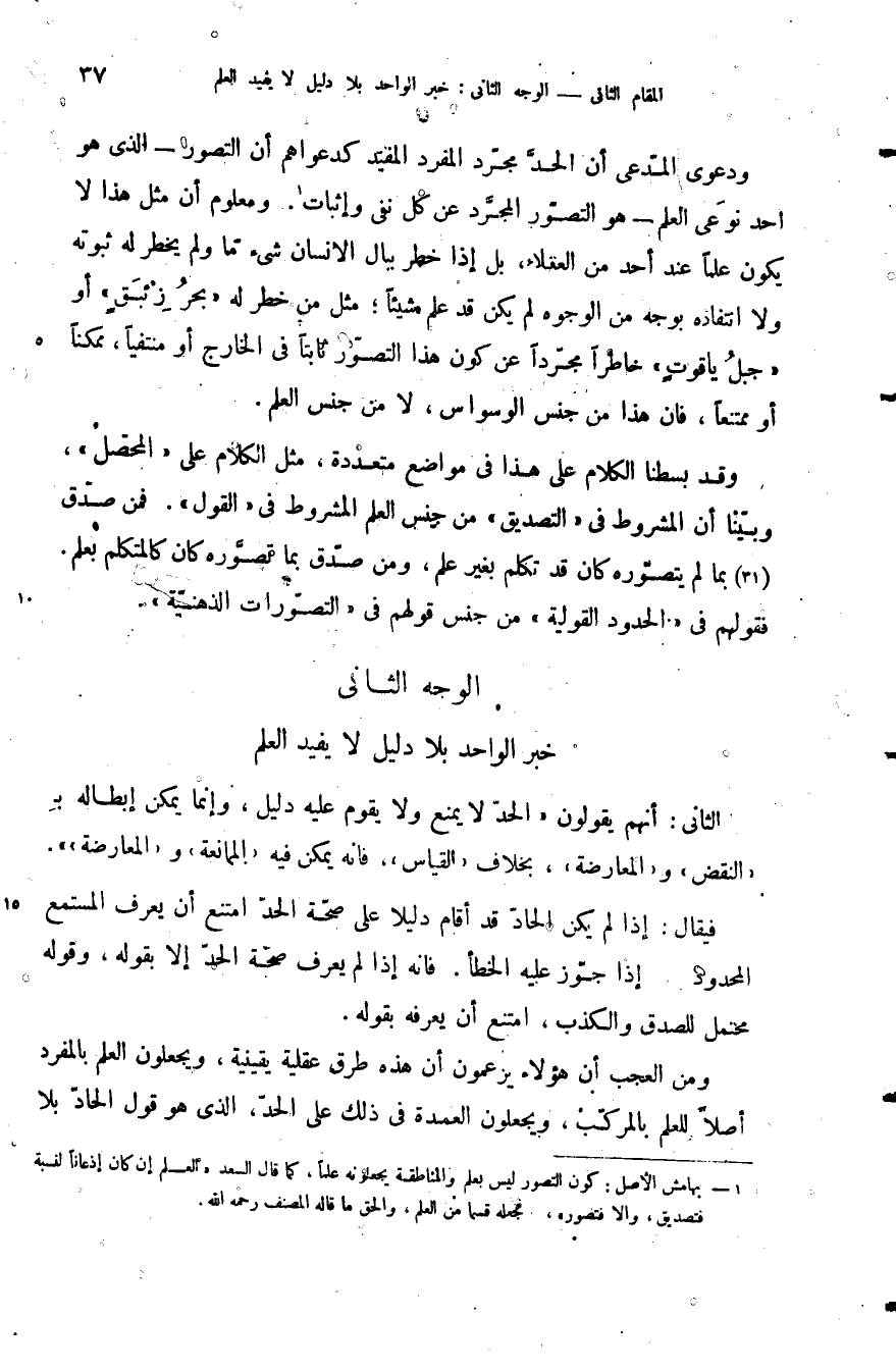 ودعوى المدعى أن الحد مجرد المفرد المفيد كدعواهم أن التصور الذي هو احد نوعى العلم هو التصور المجرد عن كل نفي وإثبات ومعلوم أن مثل هذا لا يكون علما عند أحد من العلماء بل إذا خطر ببال الإنسان شيء ما ولم يخطر له ثبوته ولا انتفاءه بوجه من الوجوه لم يكن قد علم شيئا مثل من خطر له بحر زئبق أو جبل ياقوت خاطرا مجردا عن كون هذا التصور ثابتا في الخارج أو منتفيا ممكنا أو ممتنعا فان هذا من جنس الوسواس لا من جنس العلم.