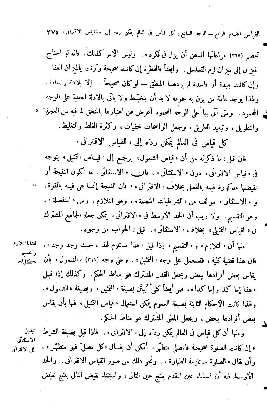 ومنها أن كل قياس في العالم يمكن رده إلى الاقترانى فإذا قيل بصيغة الشرط أن كانت الصلاة صحيحة فالمصلى متطهر أمكن أن يقال كل مصل فهو متطهر وأن يقال الصلاة مستلزمة الطهارة ونحو ذلك من صور القياس الاقتراني والحد الأوسط فيه أن استثناء عين المقدم ينتج عين التالي واستثناء نقيض التالي ينتج نقيض