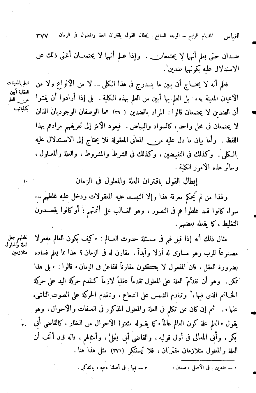 مثال ذلك أنه إذا قيل لهم في مسألة حدوث العالم كيف يكون العالم مفعولا مصنوعا للرب وهو مساوق له أزلا وأبدا مقارن له في الزمان هذا مما يعلم فساده بضرورة العقل فان المفعول لا يكون مقارنا للفاعل في الزمان قالوا بل هذا ممكن وهو أن تقدم العلة على المعلول تقدما عقليا لازما كتقدم حركة اليد على حركة الخاتم الذي فيها وتقدم الشمس على الشعاع وتقدم الحركة على الصوت الناشئ عنها ثم أن كان ممن تكلم في العلة والمعلول المذكور في الصفات والأحوال وهو يقول العلم علة كون العالم عالما كما يقوله مثبتوا الأحوال من النظار كالقاضي أبي بكر وأبي المعالي في أول قوليه والقاضي أبي يعلى وأمثالهم فانه قد ألف أن العلة والمعلول متلازمان مقترنان فلا يستنكر مثل هذا هنا