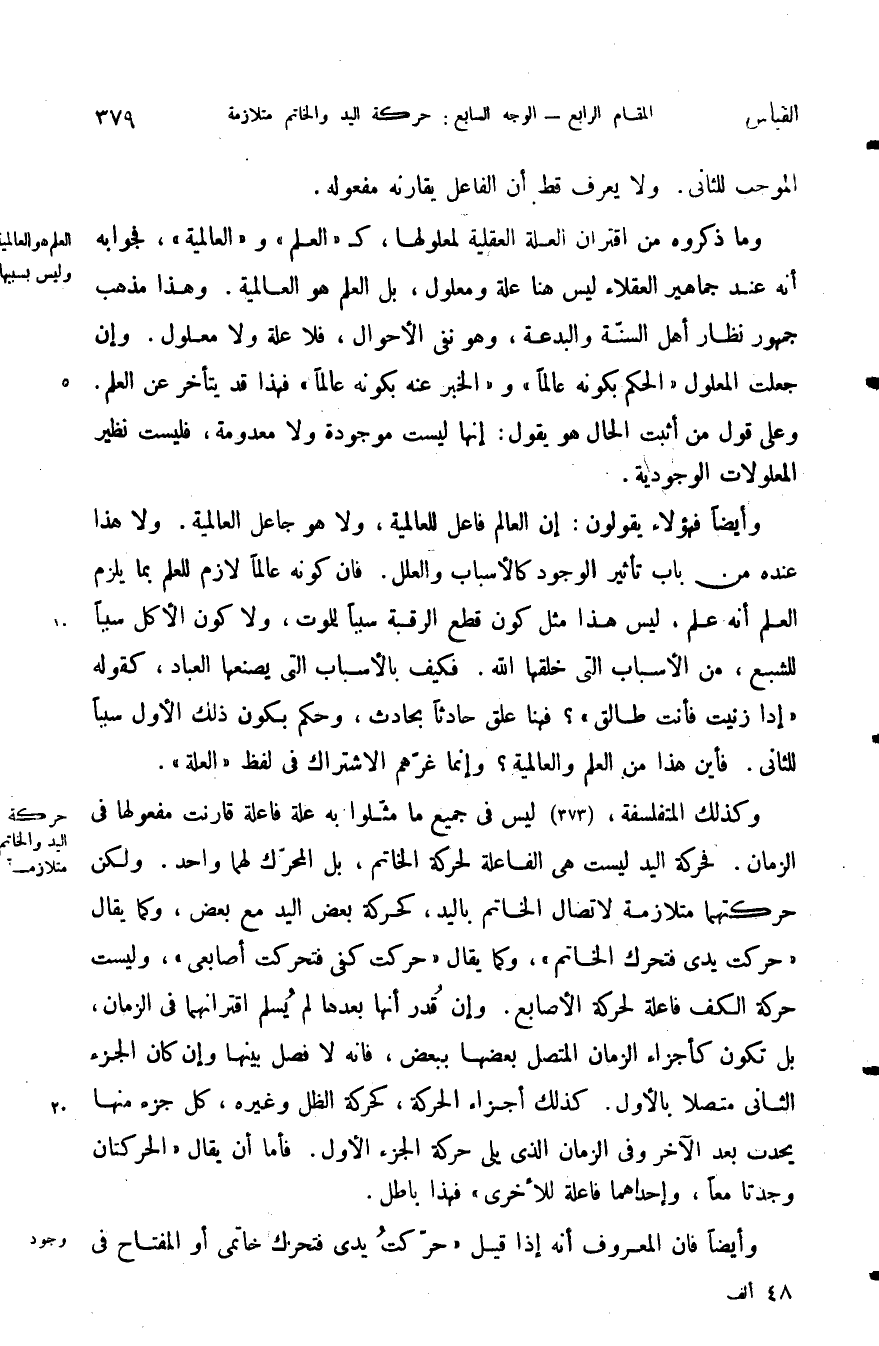 وكذلك المتفلسفة ليس في جميع ما مثلوا به علة فاعله قارنت مفعولها في الزمان فحركة اليد ليست هي الفاعلة لحركة الخاتم بل المحرك لهما واحد ولكن حركتهما متلازمة لاتصال الخاتم باليد كحركة بعض اليد مع بعض وكما يقال حركت يدي فتحرك الخاتم وكما يقال حركت كفى فتحركت أصابعي وليست حركة الكف فاعلة لحركة الأصابع وإن قدر أنها بعدها لم يسلم اقترانهما في الزمان بل تكون كأجزاء الزمان المتصل بعضها ببعض فانه لا فصل بينهما وإن كان الجزء الثاني متصلا بالأول كذلك أجزاء الحركة كحركة الظل وغيره كل جزء منها يحدث بعد الآخر وفي الزمان الذي يلي حركة الجزء الأول فأما أن يقال الحركتان وجدتا معا وأحدهما فاعلة للأخرى فهذا باطل.