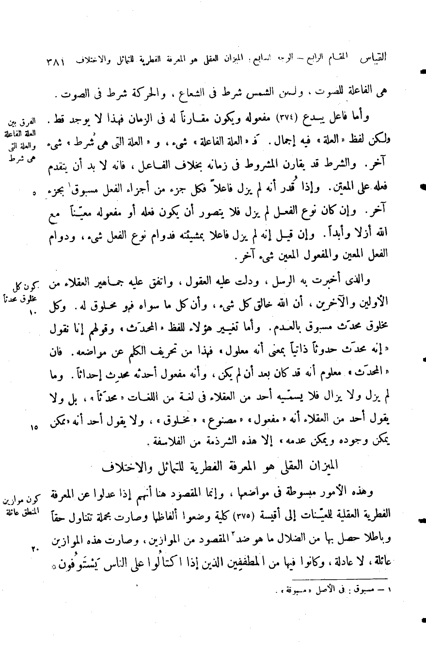 وأما فاعل يبدع مفعوله ويكون مقارنا له في الزمان فهذا لا يوجد قط لكن لفظ العلة فيه إجمال فالعلة الفاعلة شيء والعلة التي هي شرط شيء آخر والشرط قد يقارن المشروط في زمانه بخلاف الفاعل فانه لا بد أن يتقدم فعله على المعين وإذا قدر أنه لم يزل فاعلا فكل جزء من أجزاء الفعل مسبوق بجزء آخر وإن كان نوع الفعل لم يزل فلا يتصور أن يكون فعله أو مفعوله معينا مع الله أزلا وأبدا وإن قيل أنه لم يزل فاعلا بمشيئته فدوام نوع الفعل شيء ودوام الفعل المعين والمفعول المعين شيء آخر.