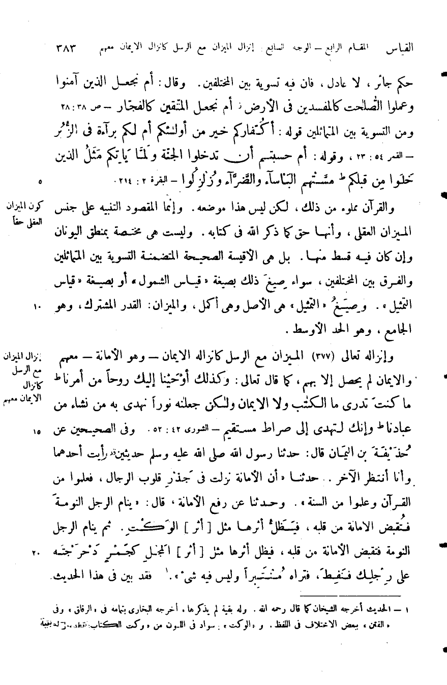 وإنزاله تعالى الميزان مع الرسل كإنزاله الإيمان وهو الأمانة معهم والإيمان لم يحصل إلا بهم كما قال تعالى: {وَكَذَلِكَ أَوْحَيْنَا إِلَيْكَ رُوحاً مِنْ أَمْرِنَا مَا كُنْتَ تَدْرِي مَا الْكِتَابُ وَلا الإيمَانُ وَلَكِنْ جَعَلْنَاهُ نُوراً نَهْدِي بِهِ مَنْ نَشَاءُ مِنْ عِبَادِنَا وَإِنَّكَ لَتَهْدِي إِلَى صِرَاطٍ مُسْتَقِيمٍ} وفي الصحيحين عن حذيفة بن اليمان قال: "حدثنا رسول الله صلى الله عليه وسلم حديثين رأيت أحدهما وأنا أنتظر الآخر حدثنا أن الأمانة نزلت في جذر قلوب الرجال فعلموا من القرآن وعلموا من السنة وحدثنا عن رفع الأمانة" قال: "ينام الرجل النومة فتقبض الأمانة من قلبه فيظل أثرها مثل أثر الوكت ثم ينام الرجل النومة فتقبض الأمانة من قلبه فيظل أثرها مثل أثر المجل كجمر دحرجته على رجلك فنفط فتراه منترا وليس فيه شيء" فقد بين في هذا الحديث