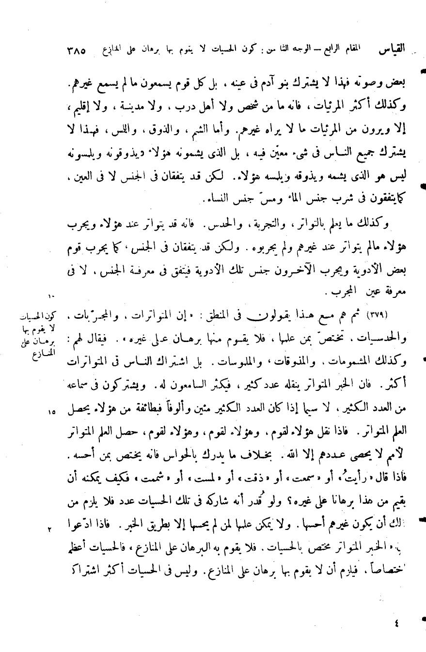 وكذلك ما يعلم بالتواتر والتجربة والحدس فانه قد يتواتر عند هؤلاء ويجرب هؤلاء ما لم يتواتر عند غيرهم ولم يجربوه ولكن قد يتفقان في الجنس كما يجرب قوم بعض الأدوية ويجرب الآخرون جنس تلك الأدوية فيتفق في معرفة الجنس لا في معرفة عين المجرب.