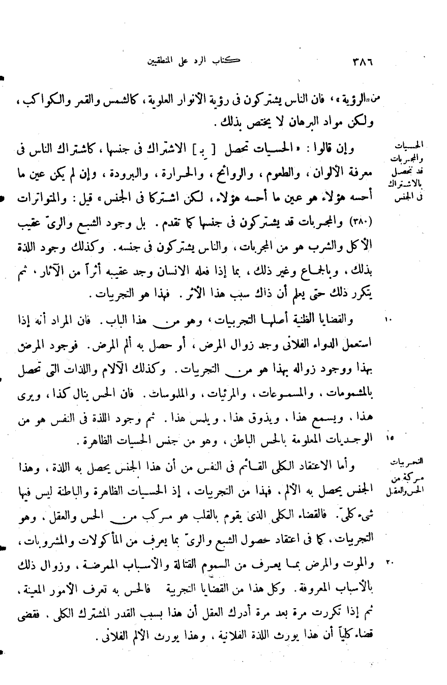 وإن قالوا الحسيات تحصل ب الاشتراك في جنسها كاشتراك الناس في معرفة الألوان والطعوم والروائح والحرارة والبرودة وإن لم يكن عين ما أحسه هؤلاء هو عين ما احسه هؤلاء لكن اشتركا في الجنس قيل والمتواترات والمجربات قد يشتركون في جنسها كما تقدم بل وجود الشبع والري عقيب الأكل والشرب هو من المجربات والناس يشتركون في جنسه وكذلك وجود اللذة بذلك وبالجماع وغير ذلك بما إذا فعله الإنسان وجد عقيبه أثرا من الآثار ثم يتكرر ذلك حتى يعلم أن ذاك سبب هذا الأثر فهذا هو التجربيات.