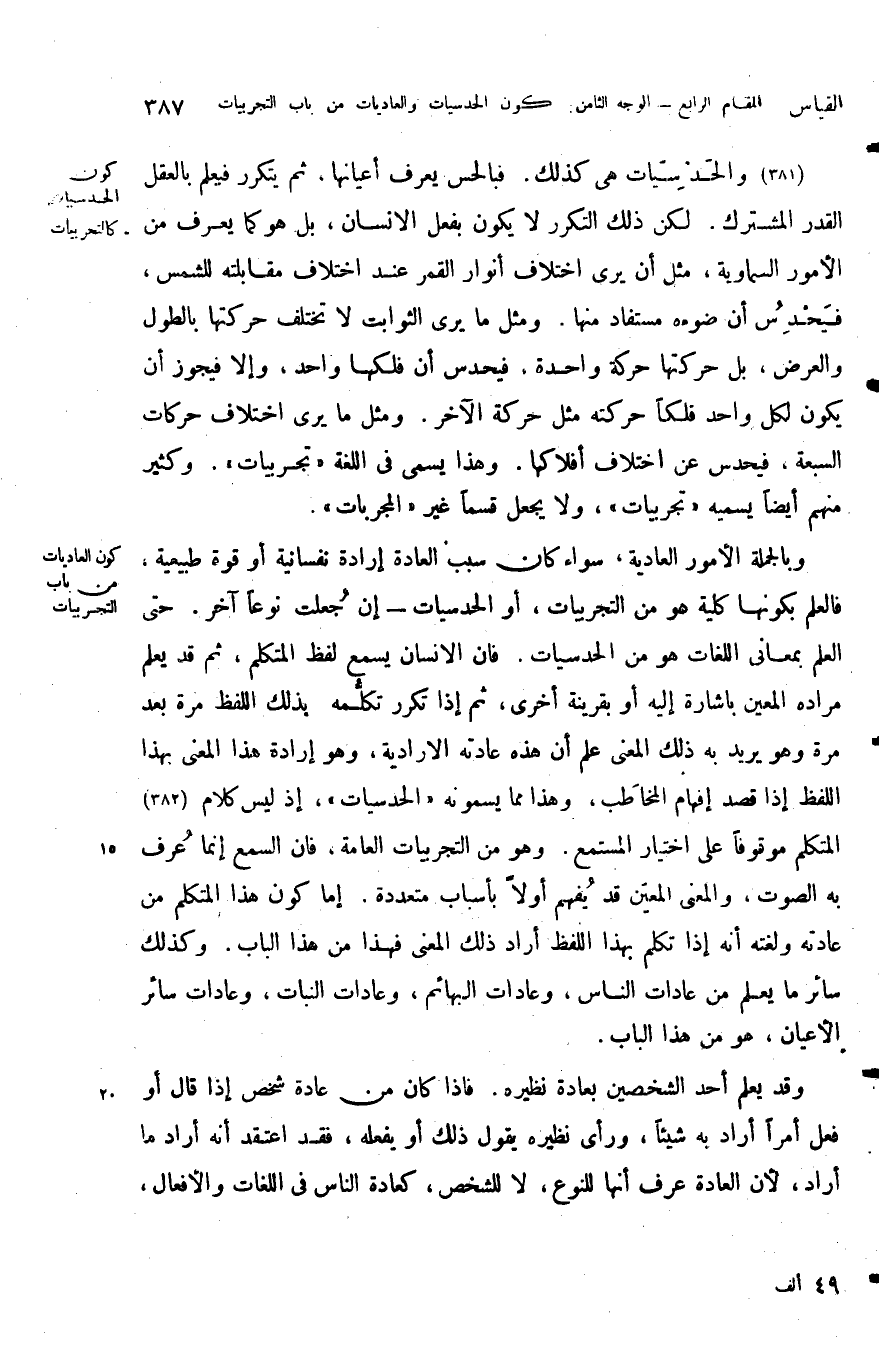 وبالجملة الأمور العادية سواء كان سبب العادة أرادة نفسانية أو قوة طبيعية فالعلم بكونها كلية هو من التجربيات أو الحدسيات أن جعلت نوعا أخر حتى العلم بمعانى اللغات هو من الحدسيات فان الإنسان يسمع لفظ المتكلم ثم قد يعلم مراده المعين بإشارة إليه أو بقرينة أخرى ثم إذا تكرر تكلمه بذلك اللفظ مرة بعد مرة وهو يريد به ذلك المعنى علم أن هذه عادته الإرادية وهو أرادة هذا المعنى بهذا اللفظ إذا قصد إفهام المخاطب وهذا مما يسمونه الحدسيات إذ ليس كلام المتكلم موقوفا على اختيار المستمع وهو من التجربيات العامة فان السمع إنما عرف به الصوت والمعنى المعين قد يفهم أولا بأسباب متعددة أما كون هذا المتكلم من عادته ولغته أنه إذا تكلم بهذا اللفظ أراد ذلك المعنى فهذا من هذا الباب وكذلك سائر ما يعلم من عادات الناس وعادات البهائم وعادات النبات وعادات سائر الأعيان هو من هذا الباب.