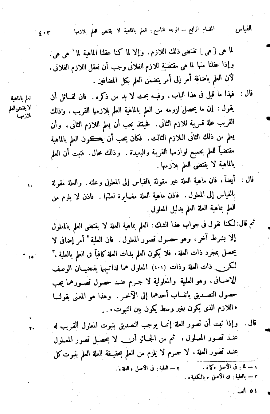 قال: "فهذا ما قيل في هذا الباب وفيه بحث لا بد من ذكره فان لقائل أن يقول أن ما يحصل لزومه من العلم بالماهية العلم بلازمها القريب وذلك القريب علة قريبة للازم الثاني فحينئذ يجب أن يعلم اللازم الثاني وان يعلم من ذلك الثاني اللازم الثالث فكان يجب أن يكون العلم بالماهية مقتضيا للعلم بجميع لوازمها القريبة والبعيدة وذلك محال فثبت أن العلم بالماهية لا يقتضى العلم بلازمها".