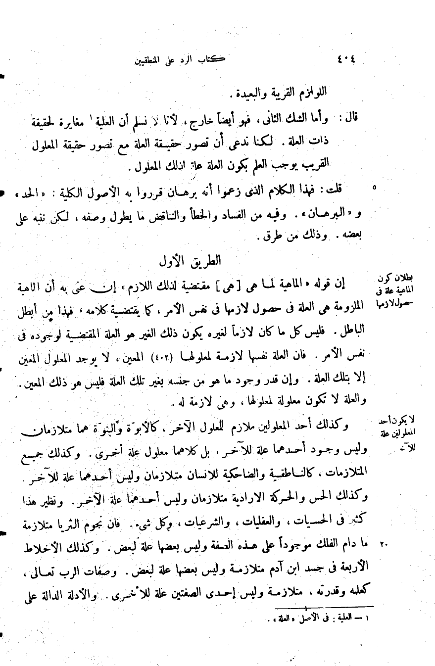 وكذلك احد المعلولين يلازم المعلول الآخر كالأبوة والبنوة هما متلازمان وليس وجود أحدهما علة للآخر بل كلاهما معلول علة أخرى وكذلك جميع المتلازمات كالناطقية والضاحكية للإنسان متلازمان وليس أحدهما علة للآخر وكذلك الحس والحركة الإرادية متلازمان وليس أحدهما علة الآخر ونظير هذا كثير في الحسيات والعقليات والشرعيات وكل شيء فان نجوم الثريا متلازمة ما دام الفلك موجودا على هذه الصفة وليس بعضها علة لبعض وكذلك الأخلاط الأربعة في جسد ابن ادم متلازمة وليس بعضها علة لبعض وصفات الرب تعالى كعلمه وقدرته متلازمة وليس إحدى الصفتين علة للأخرى والأدلة الدالة على
