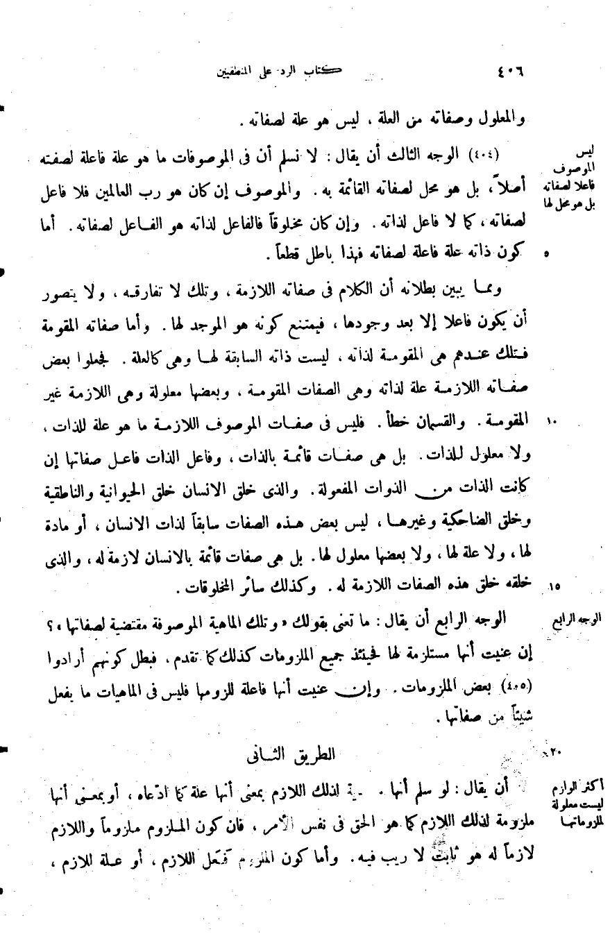 ومما يتبين بطلانه أن الكلام في صفاته اللازمة وتلك لا تفارقه ولا يتصور أن يكون فاعلا إلا بعد وجودها فيمتنع كونه هو الموجد لها وأما صفاته المقومة فتلك عندهم هي المقومة لذاته ليست ذاته السابقة لها وهي كالعلة فجعلوا بعض صفاته اللازمة علة لذاته وهي الصفات المقومة وبعضها معلولة وهي اللازمة غير المقومة والقسمان خطأ فليس في صفات الموصوف اللازمة ما هو علة للذات ولا معلول للذات بل هي صفات قائمة بالذات وفاعل الذات فاعل صفاتها أن كانت الذات من الذوات المفعولة والذي خلق الإنسان خلق الحيوانية والناطقية وخلق الضاحكية وغيرها ليس بعض هذه الصفات سابقا لذات الإنسان أو مادة لها ولا علة لها ولا بعضها معلول لها بل هي صفات قائمة بالإنسان لازمة له والذي خلقه خلق هذه الصفات اللازمة له وكذلك سائر المخلوقات.