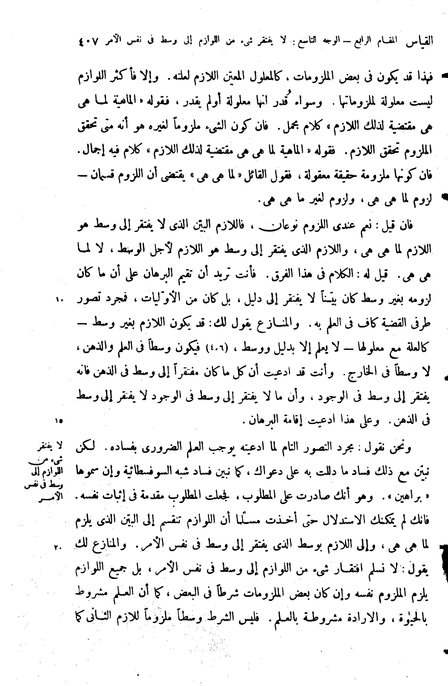 فان قيل نعم عندي اللزوم نوعان فاللازم البين الذي لا يفتقر إلى وسط هو اللازم لما هي هي واللازم الذي يفتقر إلى وسط هو اللازم لأجل الوسط لا لما هي هي قيل له الكلام في هذا الفرق فأنت تريد أن تقيم البرهان على أن ما كان لزومه بغير وسط كان بينا لا يفتقر إلى دليل بل كان من الأوليات فمجرد تصور طرفي القضية كاف في العلم به والمنازع يقول لك قد يكون اللازم بغير وسط كالعلة مع معلولها لا يعلم إلا بدليل ووسط فيكون وسطا في العلم والذهن لا وسطا في الخارج وأنت قد ادعيت أن كل ما كان مفتقرا إلى وسط في الذهن فانه يفتقر إلى وسط في الوجود وان ما لا يفتقر إلى وسط في الوجود لا يفتقر إلى وسط في الذهن وعلى هذا ادعيت إقامة البرهان.