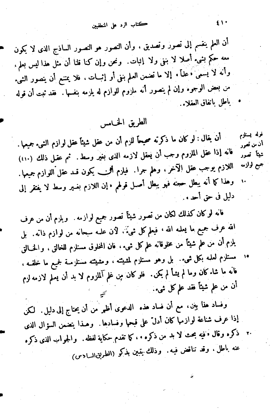 أن يقال لو كان ما ذكرته صحيحا للزم أن من عقل شيئا عقل لوازم الشيء جميعها فانه إذا عقل الملزوم وجب أن يعقل لازمه الذي بغير وسط ثم عقل ذلك اللازم يوجب عقل الآخر وهلم جرا فيلزم أن يكون قد عقل اللوازم جميعها وهذا كما أنه يبطل حجته فهو يبطل اصل قولهم أن اللازم بغير وسط لا يفتقر إلى دليل في حق احد.