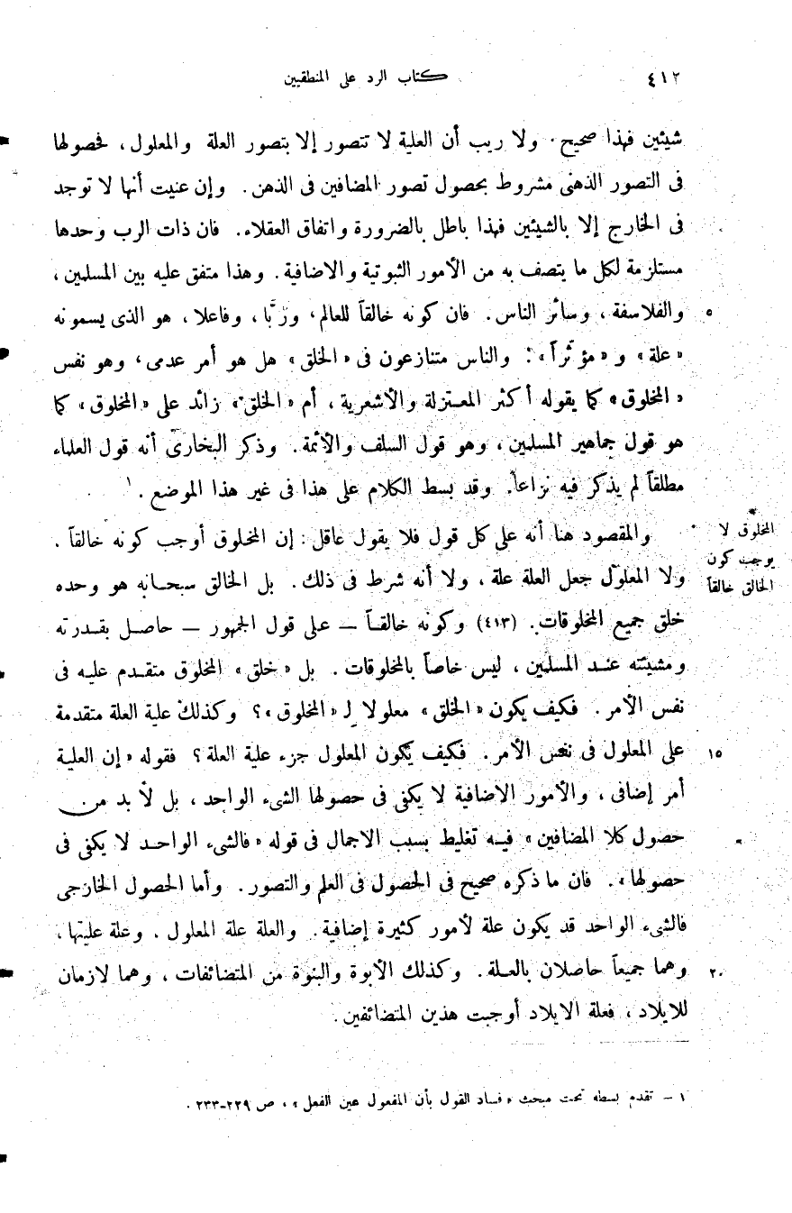 والمقصود هنا أنه على كل قول فلا يقول عاقل أن المخلوق أوجب كونه خالقا ولا المعلول جعل العلة علة ولا أنه شرط في ذلك بل الخالق سبحانه هو وحده خلق جميع المخلوقات وكونه خالقا على قول الجمهور حاصل بقدرته ومشيئته عند المسلمين ليس خاصا بالمخلوقات بل خلق المخلوق متقدم عليه في نفس الأمر فكيف يكون الخلق معلولا ل المخلوق وكذلك علية العلة متقدمة على المعلول في نفس الأمر فكيف يكون المعلول جزء علية العلة فقوله أن العلية أمر إضافي والأمور الإضافية لا يكفي في حصولها الشيء الواحد بل لا بد من حصول كلا المضافين فيه تغليط بسبب الإجمال في قوله فالشيء الواحد لا يكفي في حصولها فان ما ذكره صحيح في الحصول في العلم والتصور وأما الحصول الخارجي فالشيء الواحد قد يكون علة لأمور كثيرة إضافية والعلة علة المعلول وعلة عليتها وهما جميعا حاصلان بالعلة وكذلك الأبوة والبنوة من المتضائفات وهما لازمان للإيلاد فعلة الايلاد أوجبت هذين المتضائفين
