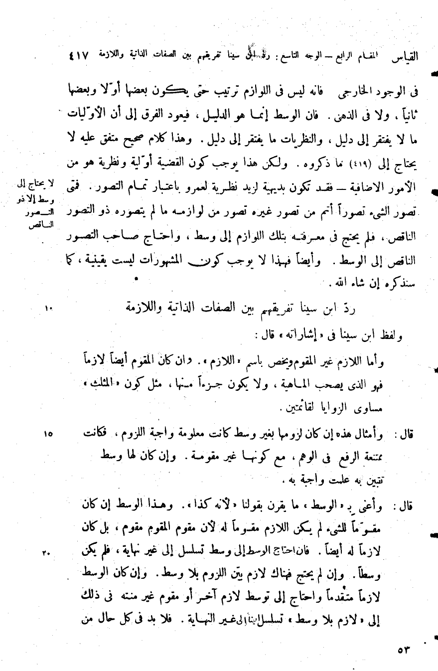 قال: "وأعني بالوسط ما يقرن بقولنا لأنه كذا وهذا الوسط أن كان مقوما للشيء لم يكن اللازم مقوما له لأن مقوم المقوم مقوم بل كان لازما له أيضا فان احتاج إلى وسط تسلسل إلى غير نهاية فلم يكن وسطا وان لم يحتج فهناك لازم بين اللزوم بلا وسط وان كان الوسط لازما متقدما واحتاج إلى توسط لازم آخر أو مقوم غير منته من ذلك إلى لازم بلا وسط تسلسل إلى غير النهاية فلا بد في كل حال من