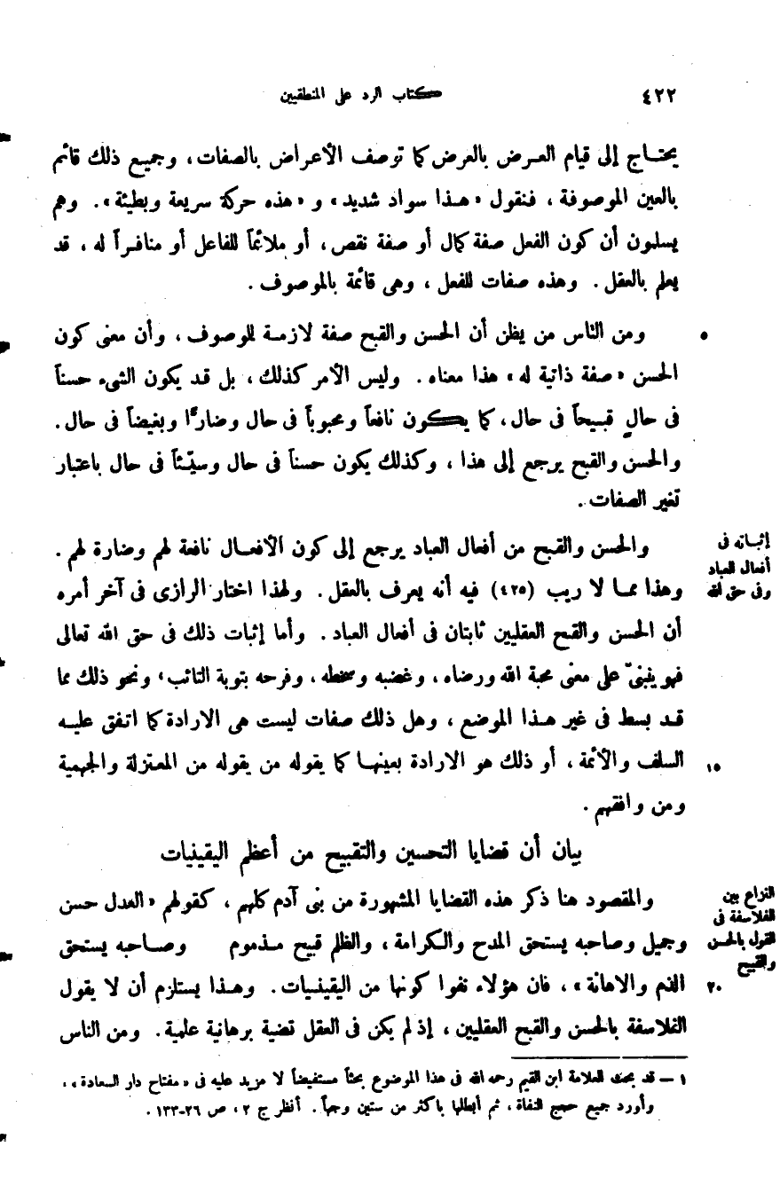 والمقصود هنا ذكر هذه القضايا المشهورة من بني ادم كلهم كقولهم العدل حسن وجميل وصاحبه يستحق المدح والكرامة والظلم قبيح مذموم سيء وصاحبه يستحق الذم والإهانة فان هؤلاء نفوا كونها من اليقينيات وهذا يستلزم أن لا يقول الفلاسفة بالحسن والقبح العقليين إذ لم يكن في العقل قضية برهانية عقلية ومن الناس