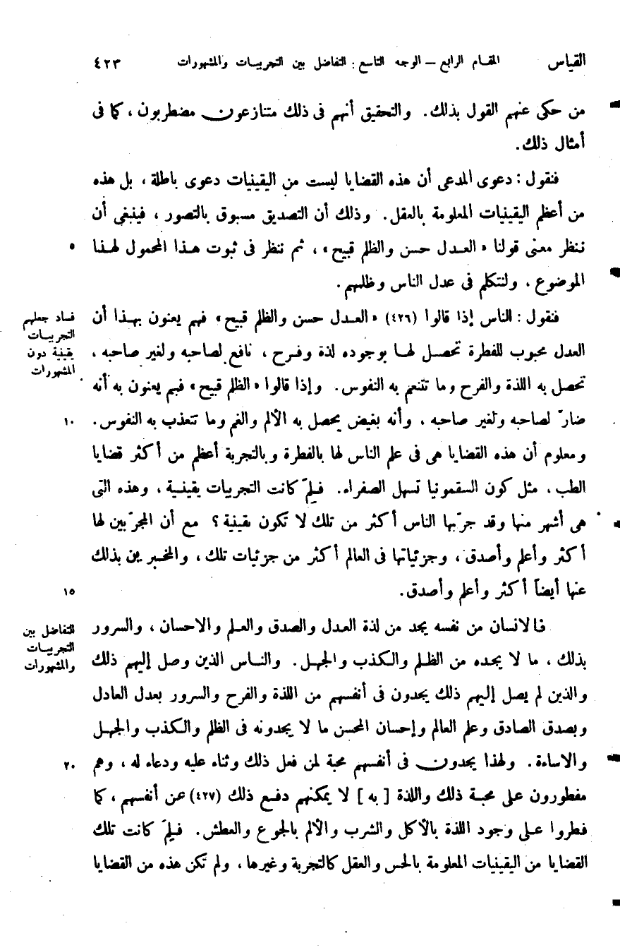 فان الإنسان من نفسه يجد من لذة العدل والصدق والعلم والإحسان والسرور بذلك ما لا يجده من الظلم والكذب والجهل والناس الذين وصل إليهم ذلك والذين لم يصل إليهم ذلك يجدون في أنفسهم من اللذة والفرح والسرور بعدل العادل وبصدق الصادق وعلم العالم وإحسان المحسن ما لا يجدونه في الظلم والكذب والجهل والإساءة ولهذا يجدون في أنفسهم محبة لمن فعل ذلك وثناء عليه ودعاء له وهم مفطورون على محبة ذلك واللذة به لا يمكنهم دفع ذلك من أنفسهم كما فطروا على وجود اللذة ب الأكل والشرب والألم بالجوع والعطش فلم كانت تلك القضايا من اليقينيات المعلومة بالحس والعقل كالتجربة وغيرها ولم تكن هذه من القضايا