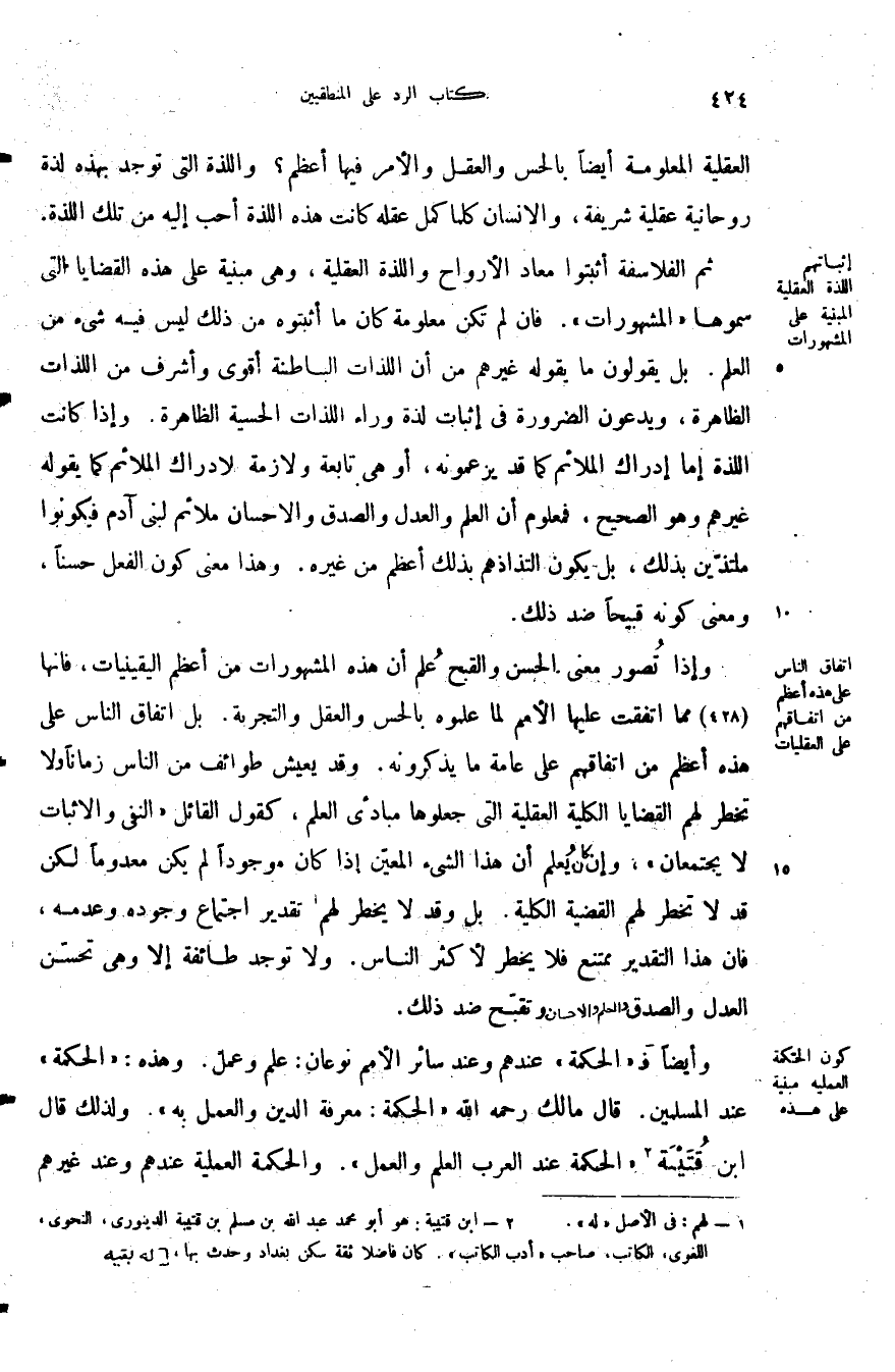 ثم الفلاسفة اثبتوا معاد الأرواح واللذة العقلية وهي مبنية على هذه القضايا التي سموها المشهورات فان لم تكن معلومة كان ما أثبتوه من ذلك ليس فيه شيء من العلم بل يقولون ما يقوله غيرهم من أن اللذات الباطنة أقوى واشرف من اللذات الظاهرة ويدعون الضرورة في إثبات لذة وراء اللذات الحسية الظاهرة وإذا كانت اللذة أما إدراك الملائم كما قد يزعمونه أو هي تابعة ولازمة للإدراك الملائم كما يقوله غيرهم وهو الصحيح فمعلوم أن العلم والعدل والصدق والإحسان ملائم لبني آدم فيكونوا ملتذين بذلك بل يكون التذاذهم بذلك أعظم من غيره وهذا معنى كون الفعل حسنا ومعنى كونه قبيحا ضد ذلك.