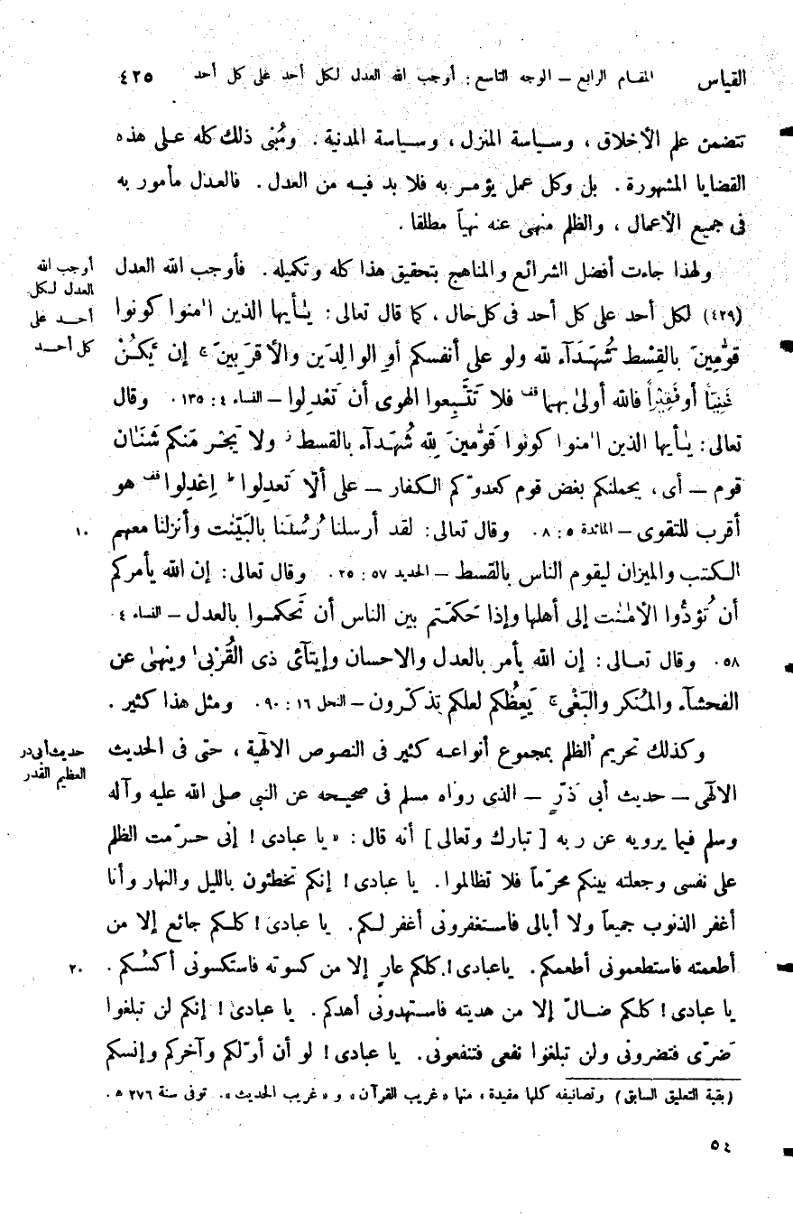 ولهذا جاءت أفضل الشرائع والمناهج بتحقيق هذا كله وتكلميه فأوجب الله العدل لكل أحد على كل أحد في كل حال كما قال تعالى: {يَا أَيُّهَا الَّذِينَ آمَنُوا كُونُوا قَوَّامِينَ بِالْقِسْطِ شُهَدَاءَ لِلَّهِ وَلَوْ عَلَى أَنْفُسِكُمْ أَوِ الْوَالِدَيْنِ وَالأَقْرَبِينَ إِنْ يَكُنْ غَنِيّاً أَوْ فَقِيراً فَاللَّهُ أَوْلَى بِهِمَا فَلا تَتَّبِعُوا الْهَوَى أَنْ تَعْدِلُوا} وقال تعالى: {يَا أَيُّهَا الَّذِينَ آمَنُوا كُونُوا قَوَّامِينَ لِلَّهِ شُهَدَاءَ بِالْقِسْطِ وَلا يَجْرِمَنَّكُمْ شَنَآنُ قَوْمٍ عَلَى ألاَّ تَعْدِلُوا اعْدِلُوا هُوَ أَقْرَبُ لِلتَّقْوَى} وقال تعالى: {لَقَدْ أَرْسَلْنَا رُسُلَنَا بِالْبَيِّنَاتِ وَأَنْزَلْنَا مَعَهُمُ الْكِتَابَ وَالْمِيزَانَ لِيَقُومَ النَّاسُ بِالْقِسْطِ} وقال تعالى: {إِنَّ اللَّهَ يَأْمُرُكُمْ أَنْ تُؤَدُّوا الأَمَانَاتِ إِلَى أَهْلِهَا وَإِذَا حَكَمْتُمْ بَيْنَ النَّاسِ أَنْ تَحْكُمُوا بِالْعَدْلِ} وقال تعالى: {إِنَّ اللَّهَ يَأْمُرُ بِالْعَدْلِ وَالإحْسَانِ وَإِيتَاءِ ذِي الْقُرْبَى وَيَنْهَى عَنِ الْفَحْشَاءِ وَالْمُنْكَرِ وَالْبَغْيِ يَعِظُكُمْ لَعَلَّكُمْ تَذَكَّرُونَ} ومثل هذا كثير.