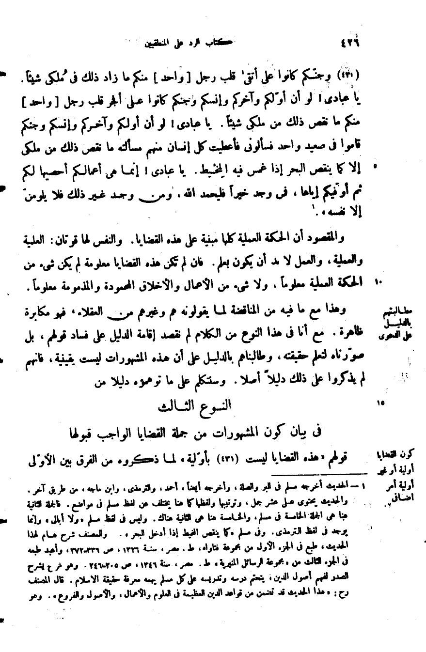 والمقصود أن الحكمة العملية كلها مبنية على هذه القضايا والنفس لها قوتان العلمية والعملية والعمل لا بد أن يكون بعلم فان لم يكن هذه القضايا معلومة لم يكن شيء من الحكمة العملية معلوما ولا شيء من الأعمال والأخلاق المحمودة والمذمومة معلوما وهذا مع ما فيه من المناقضة لما يقولونه هو وغيرهم من العقلاء فهو مكابرة ظاهرة مع أنا في هذا النوع من الكلام لم نقصد إقامة الدليل على فساد قولهم بل صورناه لتعلم حقيقته وطالبناهم بالدليل على أن هذه المشورات ليست يقينية فإنهم لم يذكروا على ذلك دليلا أصلا وسنتكلم على ما توهموه دليلا من