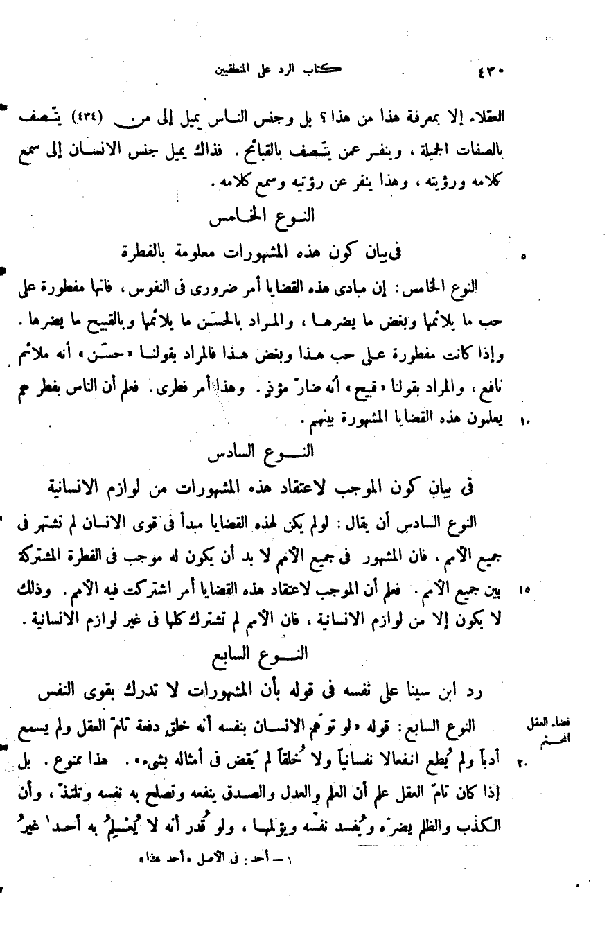 النوع السابع: قوله: "لو توهم الإنسان بنفسه أنه خلق دفعة تام العقل ولم يسمع أدبا ولم يطع انفعالا نفسانيا ولا خلقا لم يقض في أمثاله بشيء" هذا ممنوع بل أن كان تام العقل علم أن العلم والعدل والصدق ينفعه وتصلح به نفسه وتلتذ وأن الكذب والظلم يضره ويفسد نفسه ويؤلمها ولو قدر أنه لا يعلم به أحد غير
