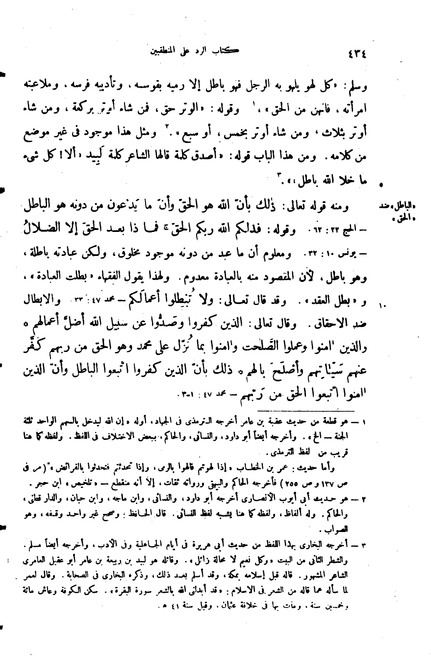 ألا كل شيء ما خلا الله باطل ... ... ... ...ومنه قوله تعالى: {ذَلِكَ بِأَنَّ اللَّهَ هُوَ الْحَقُّ وَأَنَّ مَا يَدْعُونَ مِنْ دُونِهِ هُوَ الْبَاطِلُ} وقوله: {فَذَلِكُمُ اللَّهُ رَبُّكُمُ الْحَقُّ فَمَاذَا بَعْدَ الْحَقِّ إِلاَّ الضَّلالُ} ومعلوم أن ما عبد من دونه موجود مخلوق ولكن عبادته باطلة وهو باطل لأن المقصود منه بالعبادة معدوم ولهذا يقول الفقهاء بطلت العبادة وبطل العقد وقد قال تعالى: {وَلا تُبْطِلُوا أَعْمَالَكُمْ} والإبطال ضد الإحقاق وقال تعالى: {الَّذِينَ كَفَرُوا وَصَدُّوا عَنْ سَبِيلِ اللَّهِ أَضَلَّ أَعْمَالَهُمْ وَالَّذِينَ آمَنُوا وَعَمِلُوا الصَّالِحَاتِ وَآمَنُوا بِمَا نُزِّلَ عَلَى مُحَمَّدٍ وَهُوَ الْحَقُّ مِنْ رَبِّهِمْ كَفَّرَ عَنْهُمْ سَيِّئَاتِهِمْ وَأَصْلَحَ بَالَهُمْ ذَلِكَ بِأَنَّ الَّذِينَ كَفَرُوا اتَّبَعُوا الْبَاطِلَ وَأَنَّ الَّذِينَ آمَنُوا اتَّبَعُوا الْحَقَّ مِنْ رَبِّهِمْ}