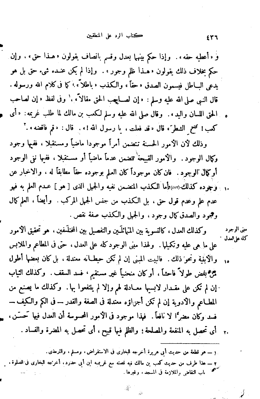 وأعطيه حقه وإذا حكم بينهما بعدل وقسم بإنصاف يقولون هذا حق وإن حكم بخلاف ذلك يقولون هذا ظلم وجور وإذا لم يكن عنده شيء حق بل هو يدعى الباطل فيسمون الصدق حقا والكذب باطلا كما في كلام الله ورسوله قال النبي صلى الله عليه وسلم: "إن لصاحب الحق مقالا " وفي لفظ: "إن لصاحب الحق اللسان واليد " وقال صلى الله عليه وسلم لكعب بن مالك لما طلب غريمه أي كعب: " دع الشطر" قال: قد فعلت يا رسول الله قال "قم فاقضه ".