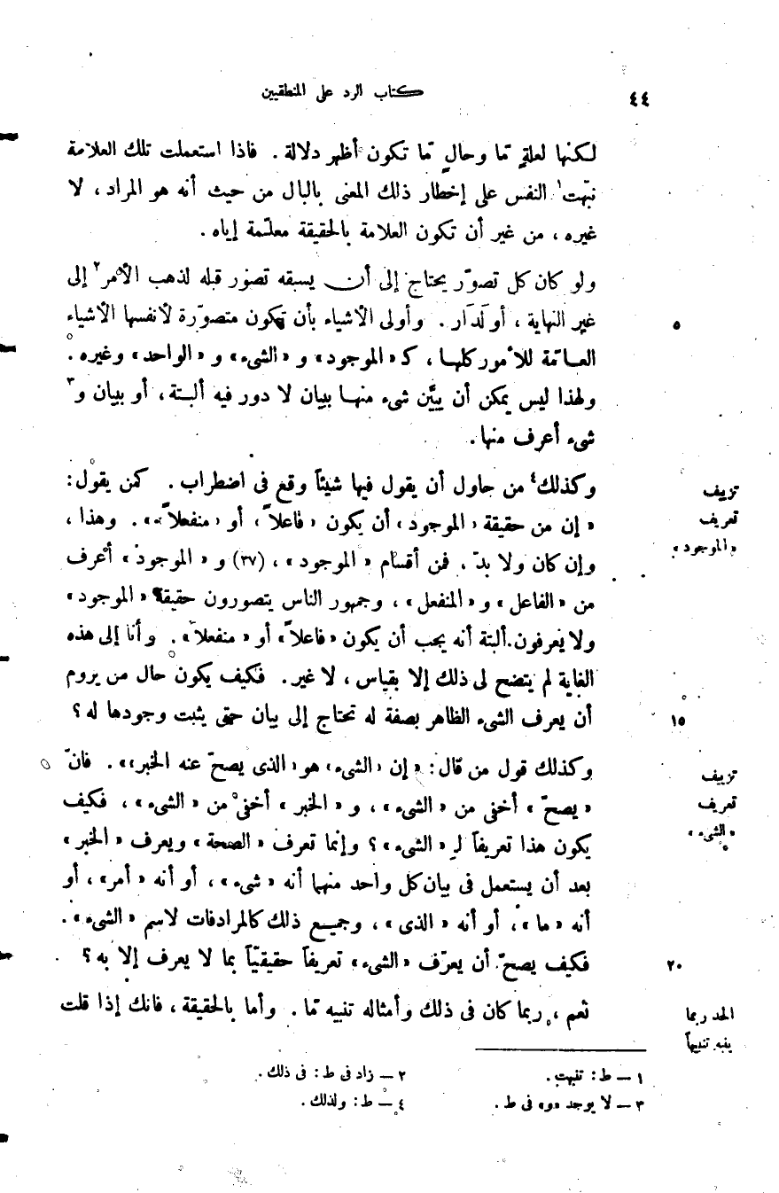 ولو كان كل تصور يحتاج إلى أن يسبقه تصور قبله لذهب الأمر إلى غير النهاية أو لدار وأولى الأشياء بأن تكون متصورة لأنفسها الأشياء العامة للأمور كلها كالموجود والشيء والواحد وغيره ولهذا ليس يمكن أن يبين شيء منها ببيان لا دور فيه ألبتة أو ببيان وشيء أعرف منها.