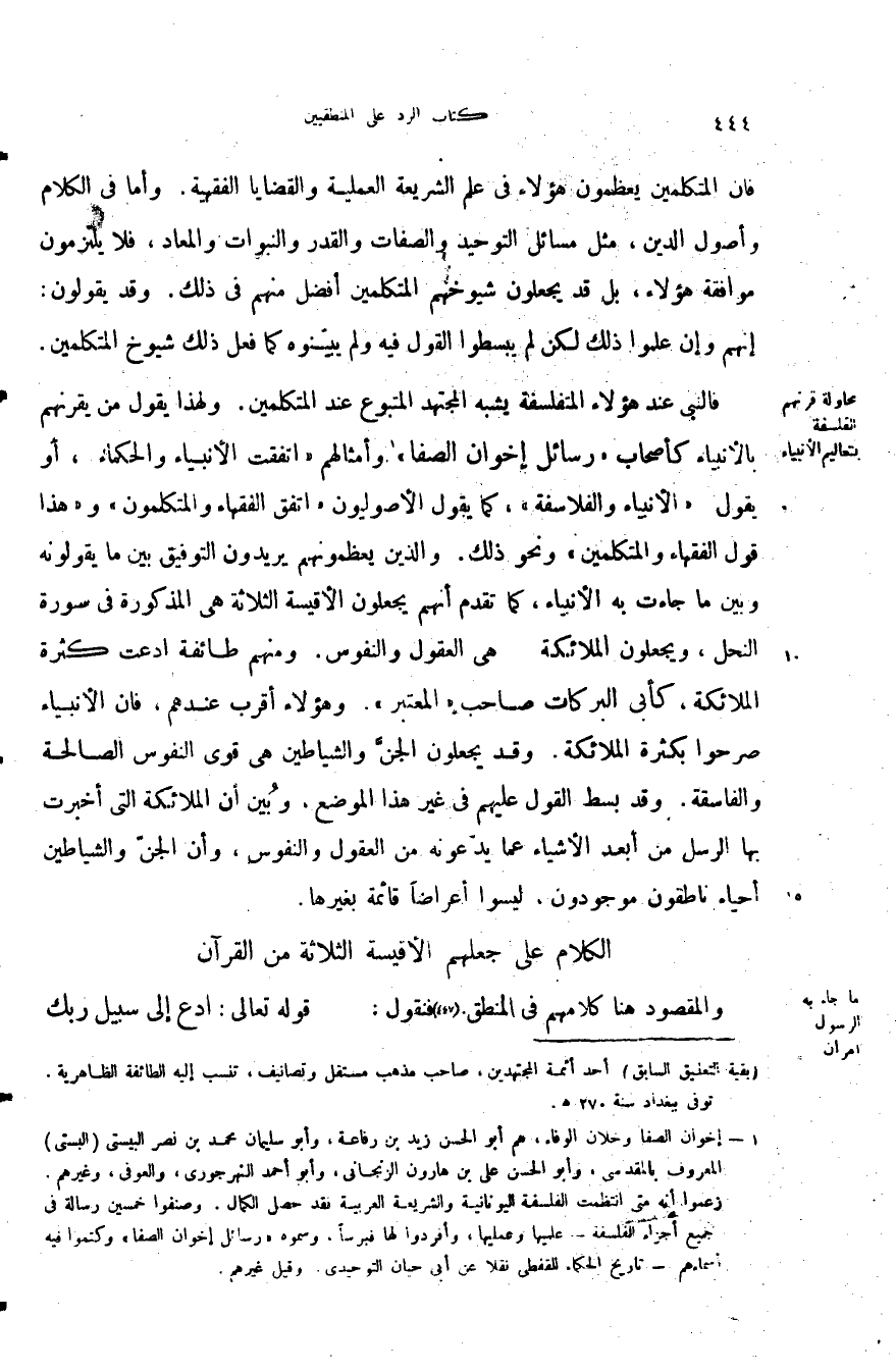 فالنبي عند هؤلاء المتفلسفة يشبه المجتهد المتبوع عند المتكلمين ولهذا يقول من يقرنهم بالأنبياء كأصحاب رسائل إخوان الصفا وأمثالهم اتفقت الأنبياء والحكماء أو يقولون الأنبياء والفلاسفة كما يقول الأصوليون اتفق الفقهاء والمتكلمون وهذا قول الفقهاء والمتكلمين ونحو ذلك والذين يعظمونهم يريدون التوفيق بين ما يقولونه وبين ما جاءت به الأنبياء كما تقدم أنهم يجعلون الأقيسة الثلاثة هي المذكورة في صورة النحل ويجعلون الملائكة هي هي العقول والنفوس ومنهم طائفة ادعت كثرة الملائكة كأبي البركات صاحب المعتبر وهؤلاء أقرب عندهم فان الأنبياء صرحوا بكثرة الملائكة وقد يجعلون الجن والشياطين هي قوى النفوس الصالحة والفلسفة وقد بسط القول عليهم في غير هذا الموضع وبين أن الملائكة التي أخبرت بها الرسل من ابعد الأشياء عما يدعونه من العقول والنفوس وان الجن والشياطين أحياء ناطقون موجودون ليسوا أعراضا قائمة بغيرها.