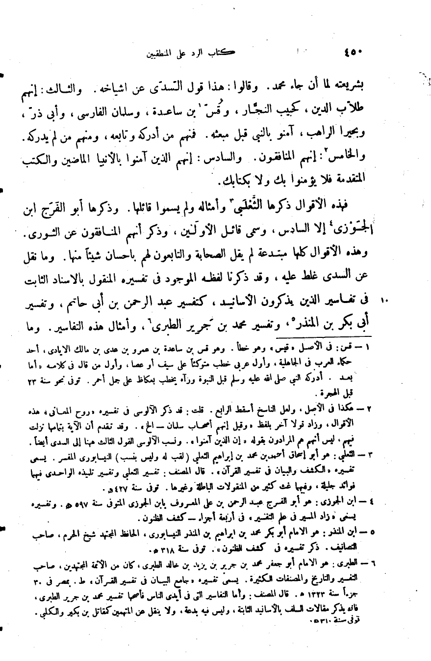 فهذه الأقوال ذكرها الثعلبي وأمثاله ولم يسموا قائلها وذكرها أبو الفرج ابن لجوزي إلا السادس وسمي قائل الأولين وذكر أنهم المنافقون عن الثوري وهذه الأقوال كلها مبتدعة لم يقل الصحابة والتابعون لهم بإحسان شيئا منها وما نقل عن السدي غلط عليه وقد ذكرنا لفظه الموجود في تفسيره المنقول بالإسناد الثابت في تفاسير الذين يذكرون الأسانيد كتفسير عبد الرحمن بن أبي حاتم وتفسير أبي بكر بن المنذر وتفسير محمد بن جرير الطبري وأمثال هذه التفاسير وما