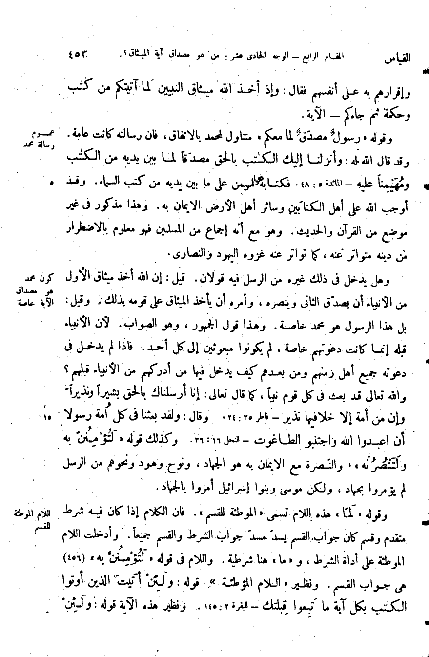وهل يدخل في ذلك غيره من الرسل؟ فيه قولان قيل: أن الله أخذ ميثاق الأول من الأنبياء أن يصدق الثاني وينصره وأمره أن يأخذ الميثاق على قومه بذلك وقيل بل هذا الرسول هو محمد خاصة وهذا قول الجمهور وهو الصواب لأن الأنبياء قبله إنما كانت دعوتهم خاصة لم يكونوا مبعوثين إلى كل أحد فإذا لم يدخل في دعوته جميع أهل زمنهم ومن بعدهم كيف يدخل فيها من أدركهم من الأنبياء قبلهم والله تعالى قد بعث في كل قوم نبيا كما قال تعالى: {إِنَّا أَرْسَلْنَاكَ بِالْحَقِّ بَشِيراً وَنَذِيراً وَإِنْ مِنْ أُمَّةٍ إِلاَّ خَلا فِيهَا نَذِيرٌ} وقال: {وَلَقَدْ بَعَثْنَا فِي كُلِّ أُمَّةٍ رَسُولاً أَنِ اعْبُدُوا اللَّهَ وَاجْتَنِبُوا الطَّاغُوتَ} وكذلك قوله: {لَتُؤْمِنُنَّ بِهِ وَلَتَنْصُرُنَّهُ} والنصرة مع الإيمان به هو الجهاد ونوح وهود ونحوهم من الرسل لم يؤمروا بجهاد ولكن موسى وبنوا إسرائيل أمروا بالجهاد.