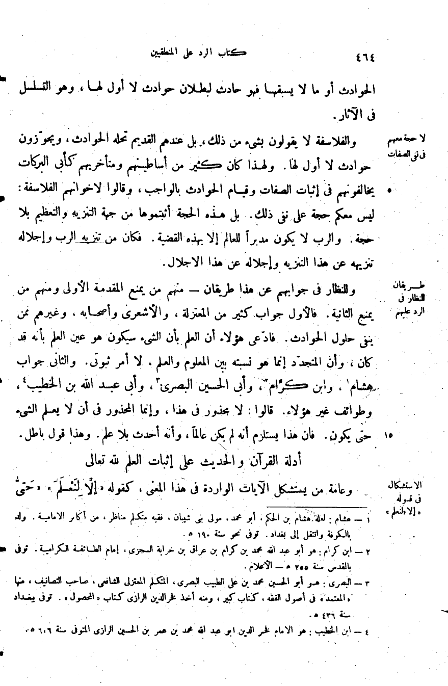 والفلاسفة لا يقولون بشيء من ذلك بل عندهم القديم تحله الحوادث ويجوزون الحوادث لا أول لها ولهذا كان كثير من أساطينهم ومتأخريهم كأبي البركات يخالفونهم في إثبات الصفات وقيام الحوادث بالواجب وقالوا لا خوانهم الفلاسفة ليس معكم حجة على نفي ذلك بل هذه الحجة أثبتموها من جهة التنزيه والتعظيم بلا حجة والرب لا يكون مدبرا للعالم إلا بهذه القضية فكان من تنزيه الرب وإجلاله تنزيهه عن هذا التنزيه وإجلاله عن هذا الإجلال.