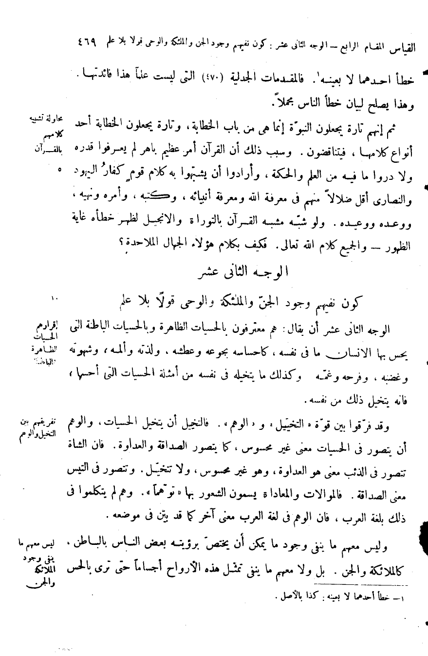 الوجه الثاني عشر: أن يقال هم معترفون بالحسيات الظاهرة وبالحسيات الباطنة التي يحس بها الإنسان ما في نفسه كإحساسه بجوعه وعطشه ولذته وألمه وشهوته وغضبه وفرحه وغمه وكذلك ما يتخيله في نفسه من أمثلة الحسيات التي أحسها فانه يتخيل ذلك من نفسه.