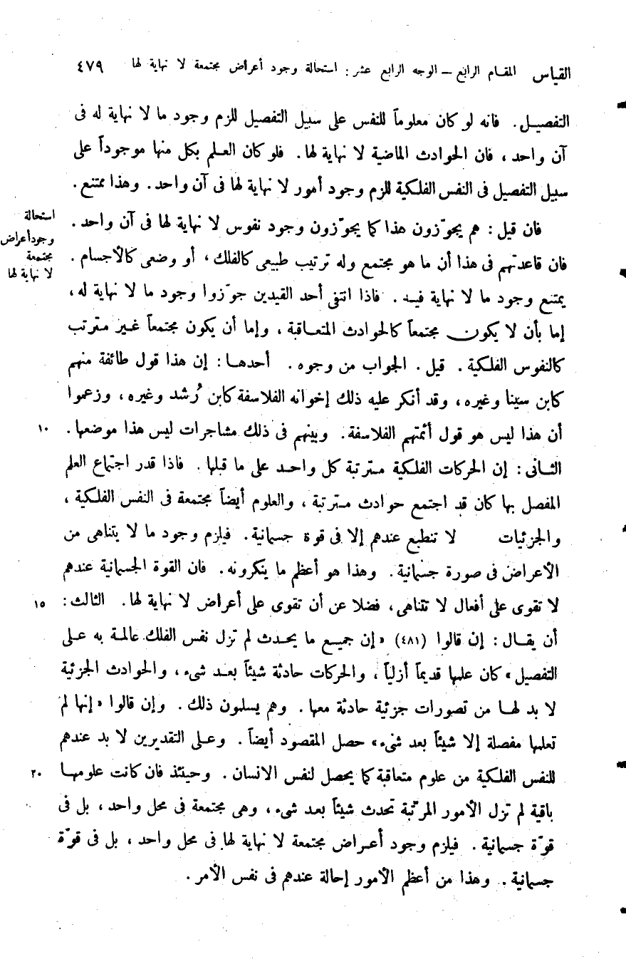 فان قيل هم يجوزون هذا كما يجوزون وجود نفوس لا نهاية لها في أن واحد فان قاعدتهم في هذا أن ما هو مجتمع وله ترتيب طبيعي كالفلك أو وضعي كالأجسام يمتنع وجود ما لا نهاية فيه فإذا انتفى أحد القيدين جوزوا وجود ما لا نهاية له أما بأن لا يكون مجتمعا كالحوادث المتعاقبة وأما أن يكون مجتمعا غير مترتب كالنفوس الفلكية قيل الجواب من وجوه أحدها أن هذا قول طائفة منهم كابن سينا وغيره وقد أنكر عليه ذلك إخوانه الفلاسفة كابن رشد وغيره وزعموا أن هذا ليس هو قول أئمتهم الفلاسفة وبينهم في ذلك مشاجرات ليس هذا موضعها الثاني أن الحركات الفلكية مترتبة كل واحد على ما قبلها فإذا قدر اجتماع العلم المفصل بها كان قد اجتمع حوادث مترتبة والعلوم أيضا مجتمعة في النفس الفلكية والجزئيات عندهم لا تنطبع عندهم إلا في قوى جسمانية فيلزم وجود ما لا يتناهى من الأعراض في صورة جسمانية وهذا هو أعظم ما ينكرونه فان القوة الجسمانية عندهم لا تقوى على أفعال لا تتناهى فضلا عن أن تقوى على أعراض لا نهاية لها الثالث أن يقال أن قالوا أن جميع ما يحدث لم تزل نفس الفلك عالمة به على التفصيل كان علمها قديما أزليا والحركات حادثة شيئا بعد شيء والحوادث الجزئية لا بد لها من تصورات جزئية حادثة معها وهم يسلمون ذلك وإن قالوا أنها لم تعلمها مفصلة إلا شيئا بعد شيء حصل المقصود أيضا وعلى التقديرين لا بد عندهم للنفس الفلكية من علوم متعاقبة كما يحصل لنفس الإنسان وحينئذ فان كانت علومها باقية لم تزل الأمور المرتبة تحدث شيئا بعد شيء وهى مجتمعه في محل واحد بل في قوة جسمانية فيلزم وجود أعراض مجتمعة لا نهاية لها في محل واحد بل في قوة جسمانية وهذا من أعظم الأمور إحالة عندهم في نفس الأمر