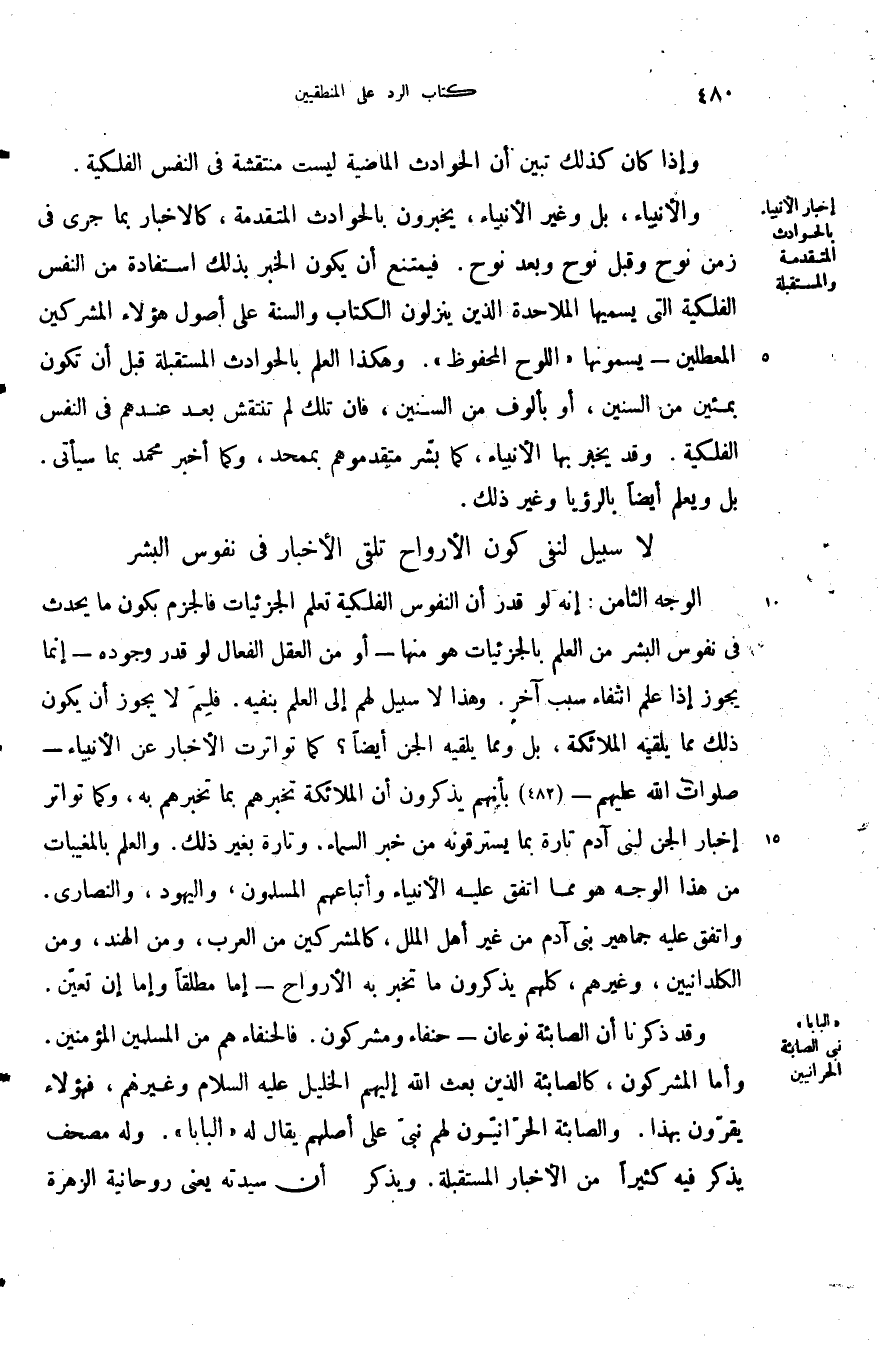 والأنبياء بل وغير الأنبياء يخبرون بالحوادث المتقدمة كالأخبار بما جرى في زمن نوح وقبل نوح وبعد نوح فيمتنع أن يكون الخبر بذلك استفادة من النفس الفلكية التي يسميها الملاحدة الذين ينزلون الكتاب والسنة على أصول هؤلاء المشركين المعطلين يسمونها اللوح المحفوظ وهكذا العلم بالحوادث المستقبلة قبل أن تكون بمئين من السنين أو بألوف من السنين فان تلك لم تنتقش بعد عندهم في النفس الفلكية وقد يخبر بها الأنبياء كما بشر متقدموهم بممحد وكما أخبر محمد بما سيأتي بل ويعلم أيضا بالرؤيا وغير ذلك.