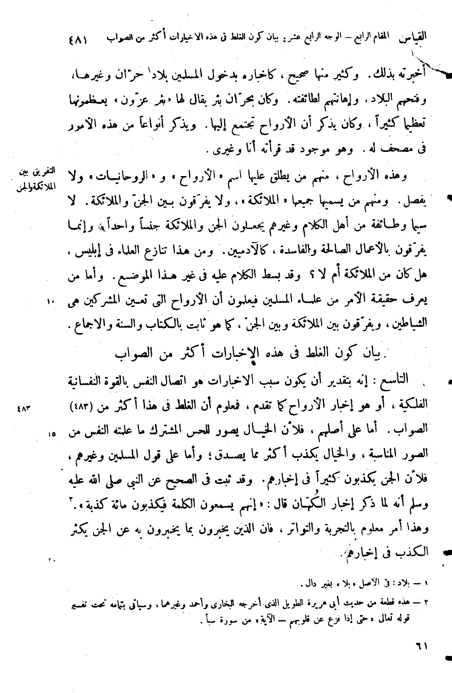التاسع أنه بتقدير أن يكون سبب الإخبارات هو اتصال النفس بالقوة النفسانية الفلكية أو هو إخبار الأرواح كما تقدم فمعلوم أن الغلط في هذا أكثر من الصواب أما على أصلهم فلأن الخيال يصور للحس المشترك ما علمته النفس من الصور المناسبة والخيال يكذب أكثر مما يصدق وأما على قول المسلمين وغيرهم فلأن الجن يكذبون كثيرا في إخبارهم وقد ثبت في الصحيح عن النبي صلى الله عليه وسلم أنه لما ذكر إخبار الكهان قال أنهم يسمعون الكلمة فيكذبون مائة كذبة وهذا أمر معلوم بالتجربة والتواتر فان الذين يخبرون بما يخبرون به عن الجن يكثر الكذب في إخبارهم