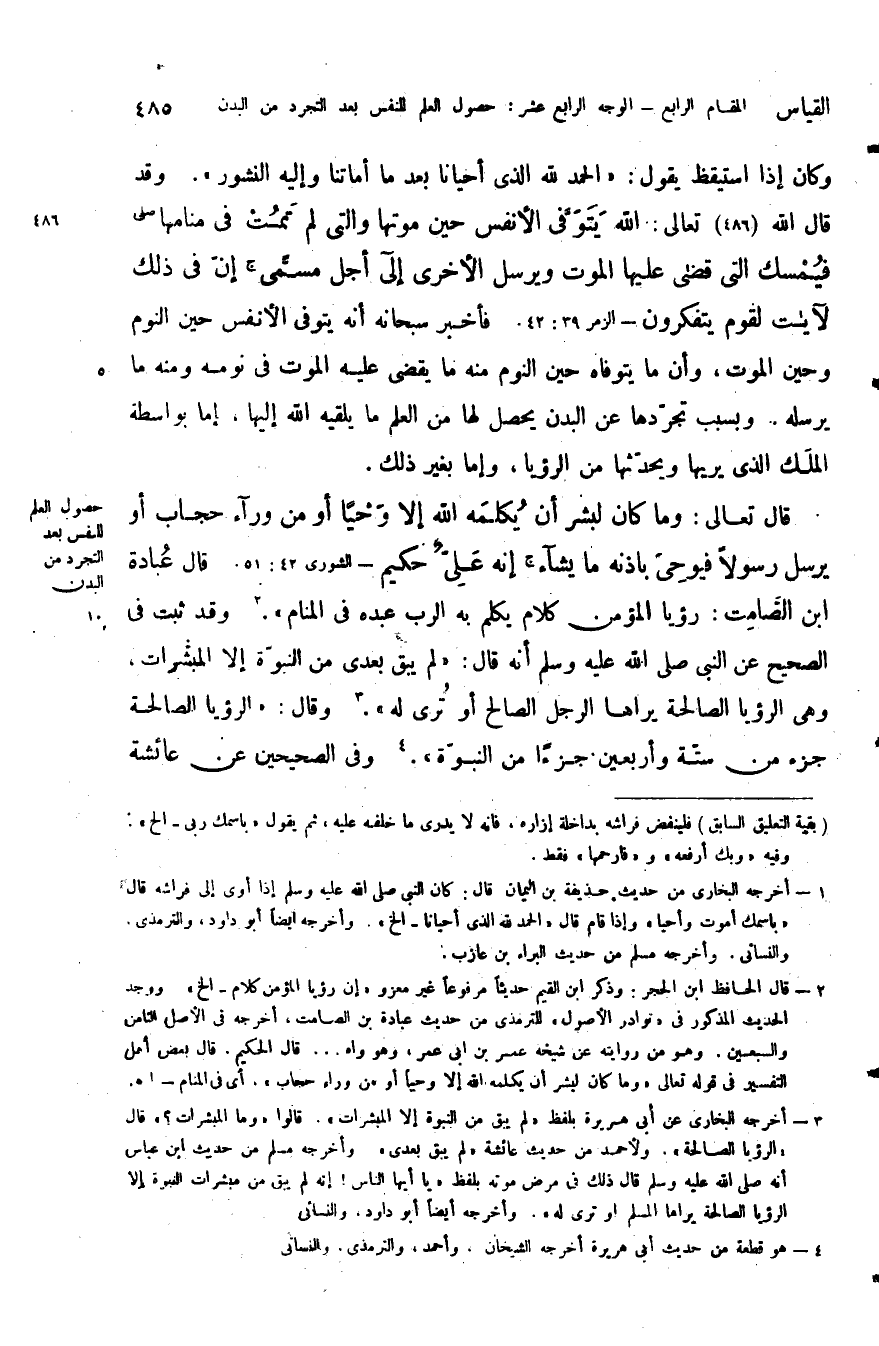 وكان ذا استيقظ يقول: "الحمد لله الذي أحيانا بعد ما أمتنا واليه النشور " وقد قال الله تعالى: {اللَّهُ يَتَوَفَّى الأَنْفُسَ حِينَ مَوْتِهَا وَالَّتِي لَمْ تَمُتْ فِي مَنَامِهَا فَيُمْسِكُ الَّتِي قَضَى عَلَيْهَا الْمَوْتَ وَيُرْسِلُ الأُخْرَى إِلَى أَجَلٍ مُسَمّىً إِنَّ فِي ذَلِكَ لآياتٍ لِقَوْمٍ يَتَفَكَّرُونَ} فأخبر سبحانه أنه يتوفى الأنفس حين النوم وحين الموت وأن ما يتوفاه حين النوم منه ما يقضى عليه الموت في نومه ومنه ما يرسله وبسبب تجردها عن البدن يحصل لها من العلم ما يلقيه الله إليها أما بواسطة الملك الذي يريها ويحدثها من الرؤيا وأما بغير ذلك.