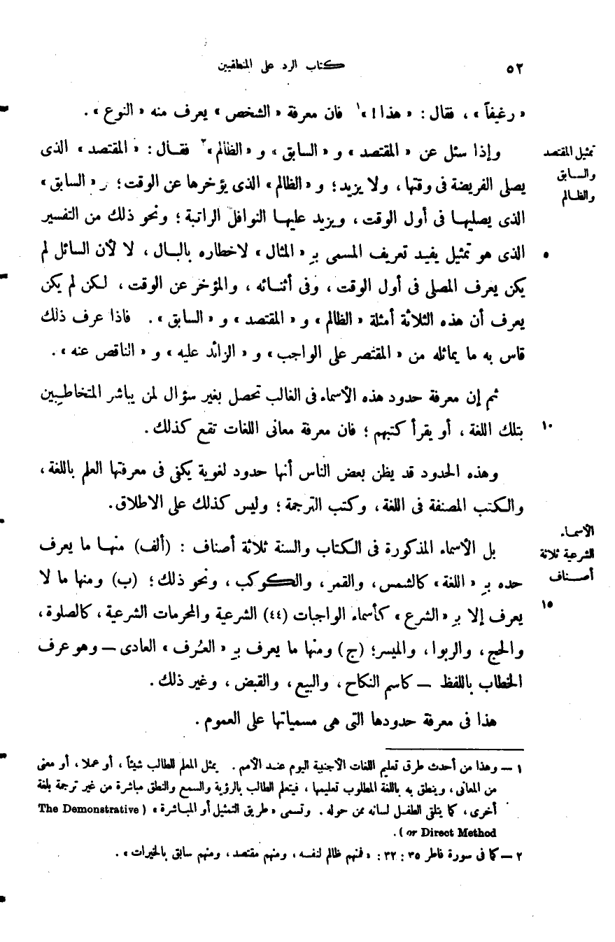 وإذا سئل عن المقتصد والسابق والظالم فقال: المقتصد الذي يصلي الفريضة في وقتها ولا يزيد والظالم الذي يؤخرها عن الوقت والسابق الذي يصليها في أول الوقت ويزيد عليها النوافل الراتبة ونحو ذلك من التفسير الذي هو تمثيل يفيد تعريف المسمى ب المثال لإخطاره بالبال لا لأن السائل لم يكن يعرف المصلي في أول الوقت وفي أثنائه والمؤخر عن الوقت لكن لم يكن يعرف أن هذه الثلاثة أمثلة الظالم والمقتصد والسابق فإذا عرف ذلك قاس به ما يماثله من المقتصر على الواجب والزائد عليه والناقص عنه.