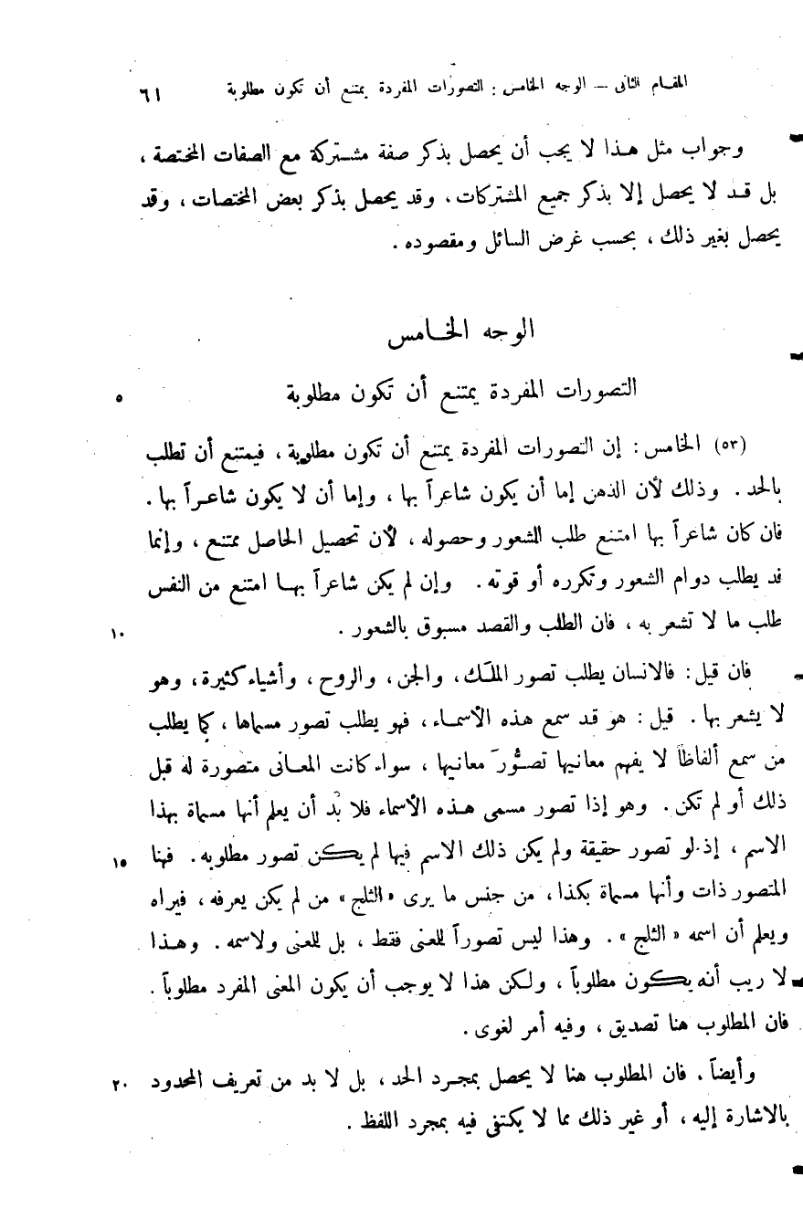 الخامس: أن التصورات المفردة يمتنع أن تكون مطلوبة فيمتنع أن تطلب بالحد وذلك لأن الذهن أما أن يكون شاعرا بها وأما أن لا يكون شاعرا بها فان كان شاعرا بها امتنع طلب الشعور وحصوله لأن تحصيل الحاصل ممتنع وإنما قد يطلب دوام الشعور وتكرره أو قوته وإن لم يكن شاعرا بها امتنع من النفس طلب ما لا تشعر به فان الطلب والقصد مسبوق بالشعور.