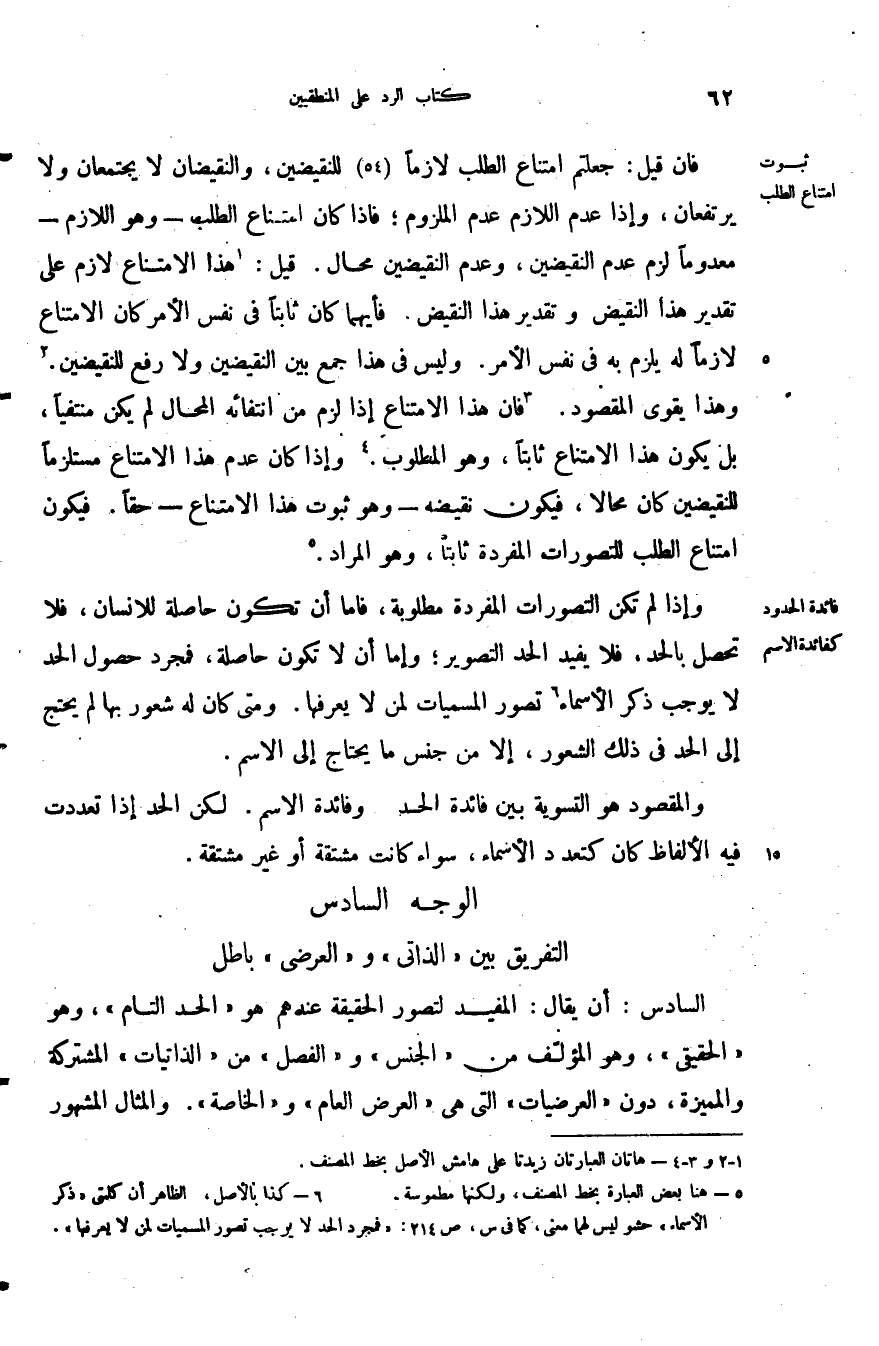 فان قيل جعلتم امتناع الطلب لازما للنقيضين والنقيضان لا يجتمعان ولا يرتفعان وإذا عدم اللازم عدم الملزوم فإذا كان امتناع الطلب وهو اللازم معدوما لزم عدم النقيضين وعدم النقيضين محال قيل هذا الامتناع لازم على تقدير هذا النقيض أو تقدير هذا النقيض فأيهما كان ثابتا في نفس الأمر كان الامتناع لازما له يلزم به في نفس الأمر وليس في هذا جمع بين النقيضين ولا رفع للنقيضين وهذا يقوى المقصود فان هذا الامتناع إذا لزم من انتفائه المحال لم يكن منتفيا بل يكون هذا الامتناع ثابتا وهو المطلوب وإذا كان عدم هذا الامتناع مستلزما للنقيضين كان محالا فيكون نقيضه وهو ثبوت هذا الامتناع حقا فيكون امتناع الطلب للتصورات المفردة ثابتا وهو المراد.